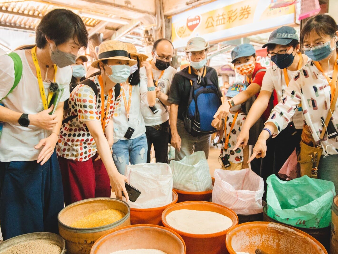 走入市場向米店見學,認識台灣人常吃的蓬萊米(粳米)、做粄食的在來米(秈米)、和包粽子會用到的糯米。