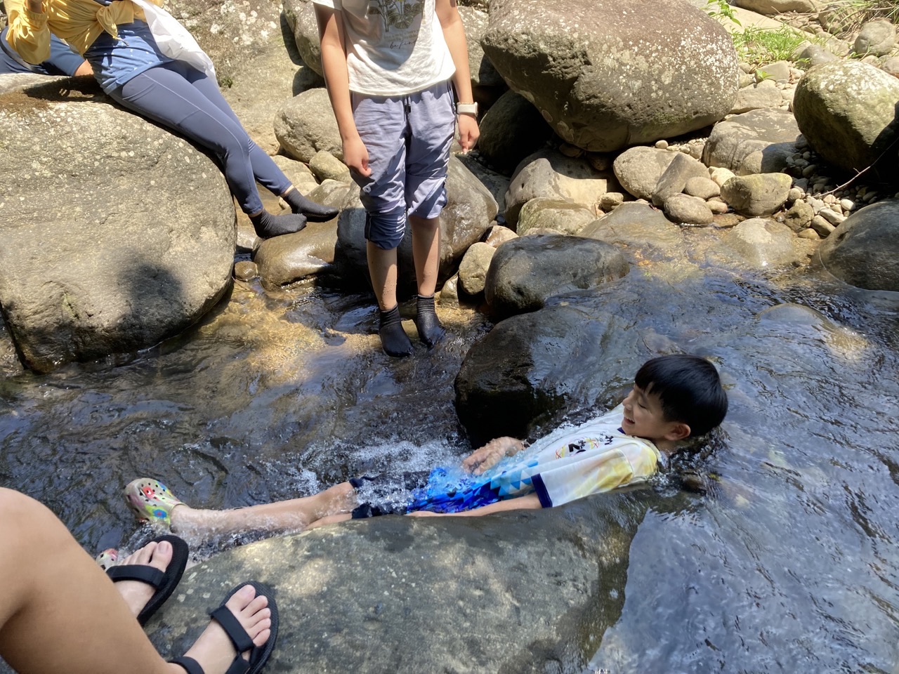 阿翔帶著大家往更上游走,濕滑的石子與水流考驗行走功力。大家可要非常小心,因為一旦跌坐到水裡,就會因為太過舒服不想起身了呢!其實就這樣靜靜的躺在水裡、在溪畔或坐或躺,平時緊繃的身心,也似乎能在大自然的音響與按摩中得到舒緩。
