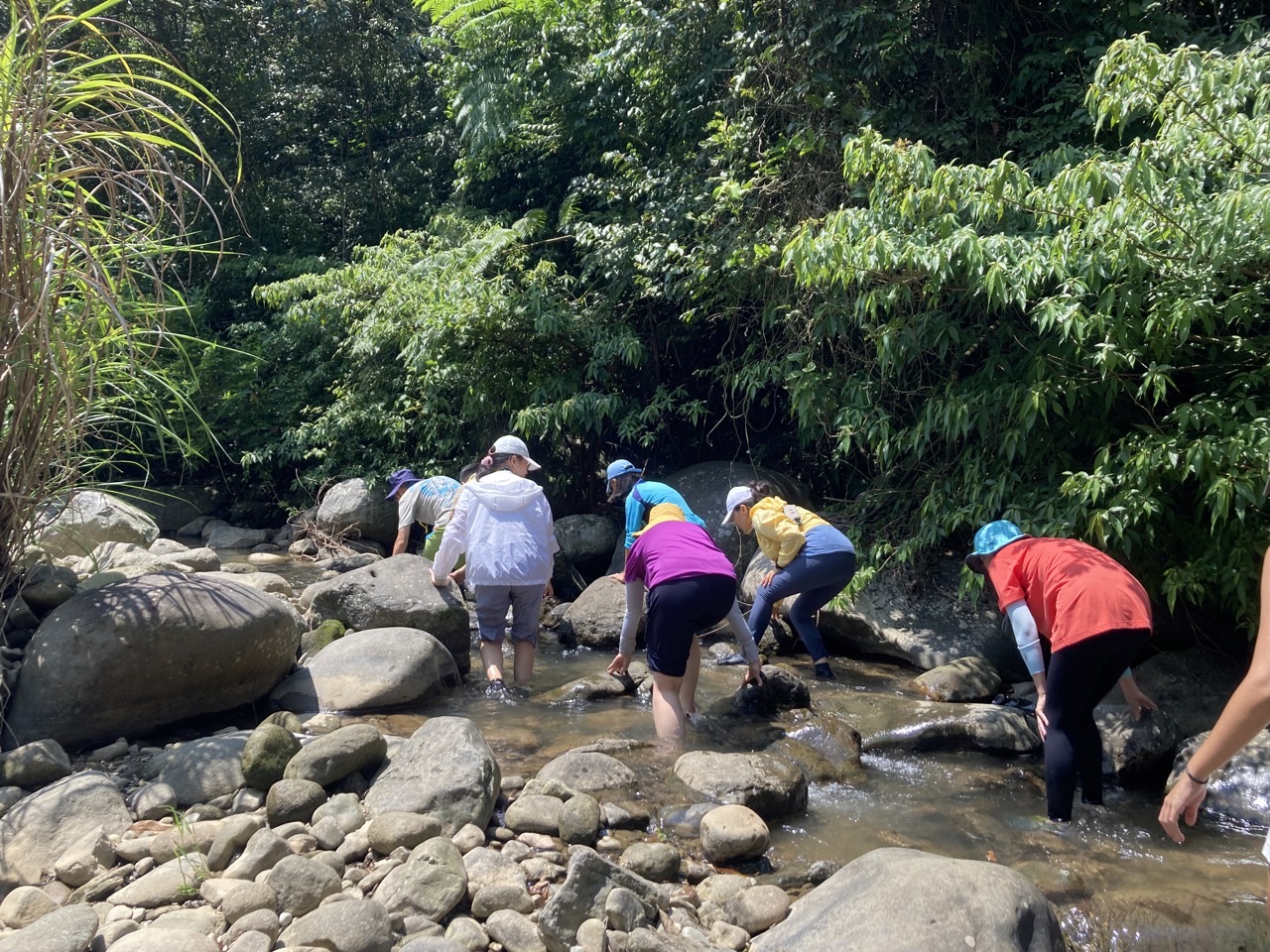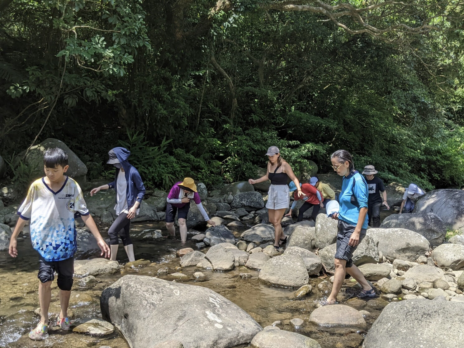 初來乍到的旅人們難免不「熟溪」,對水域充滿新奇與未知,阿翔透過前導說明建構安全體驗溪流的知識:「一條溪有許多不同地形,……涉水行走時要往低窪處踩穩,避免長滿藻類的溪石上。」相比自行探險,有熟悉在地水文的達人帶路下,旅人們更能安心親近水域,並在深度導覽中認識在地豐富生態。