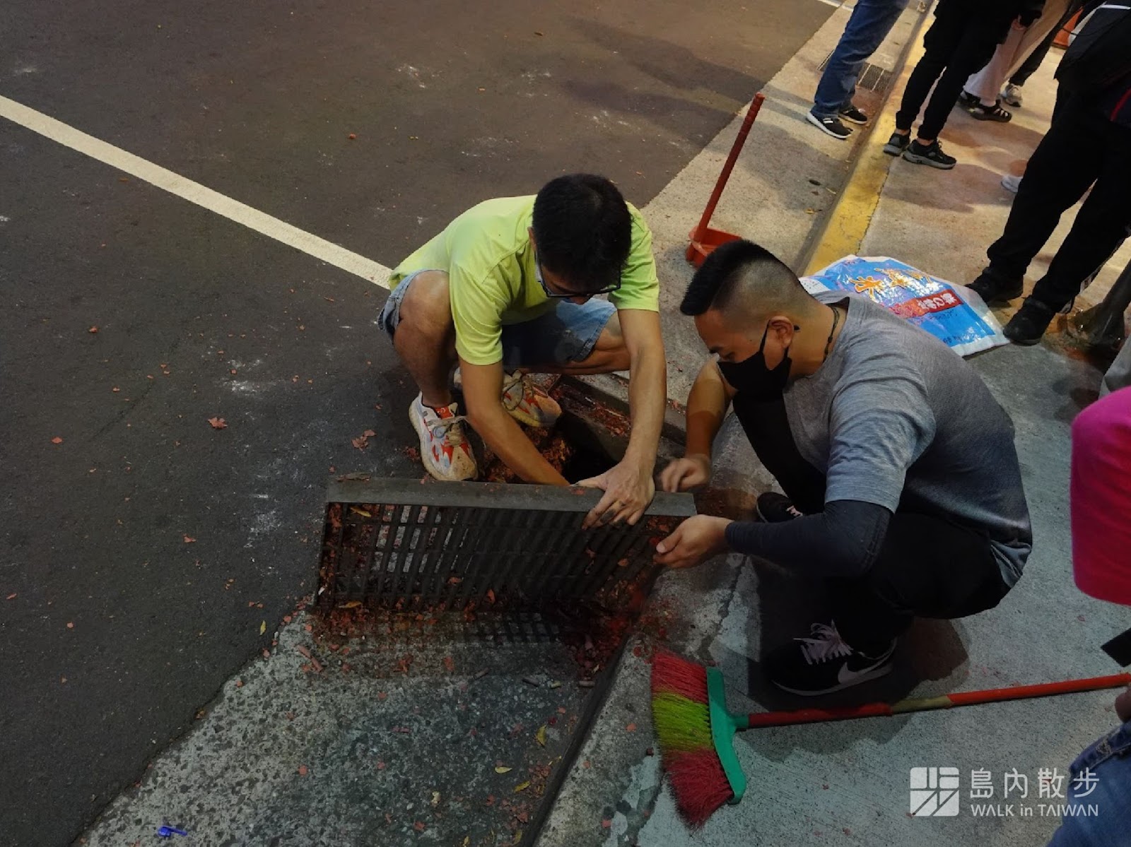 隨著陣頭清掃鞭炮的志工(島內散步攝)