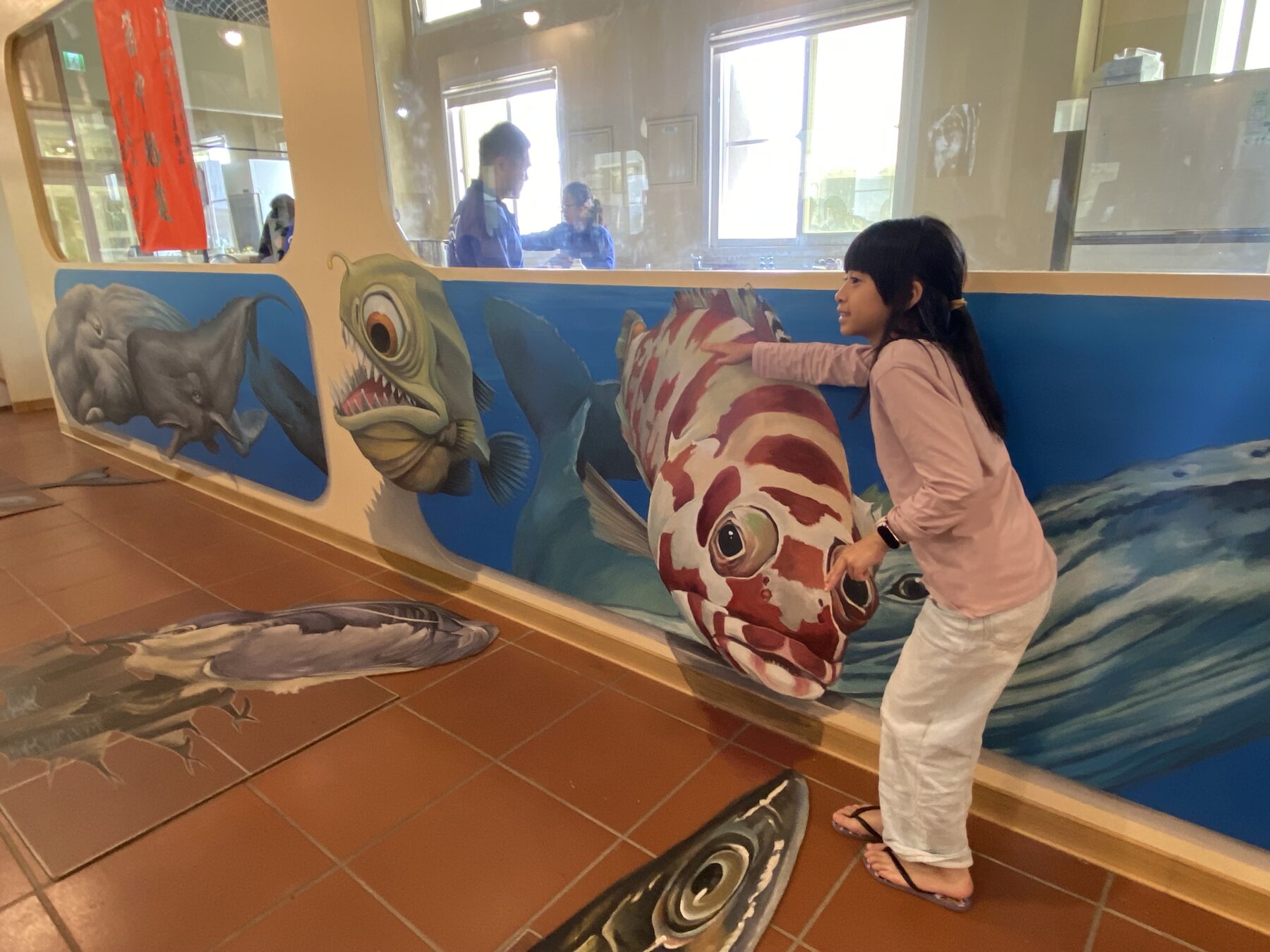 (右)藝術家結合在地特色創作 3D 立體彩繪,在船屋內與民眾創造沉浸式體驗互動。(島內散步攝)