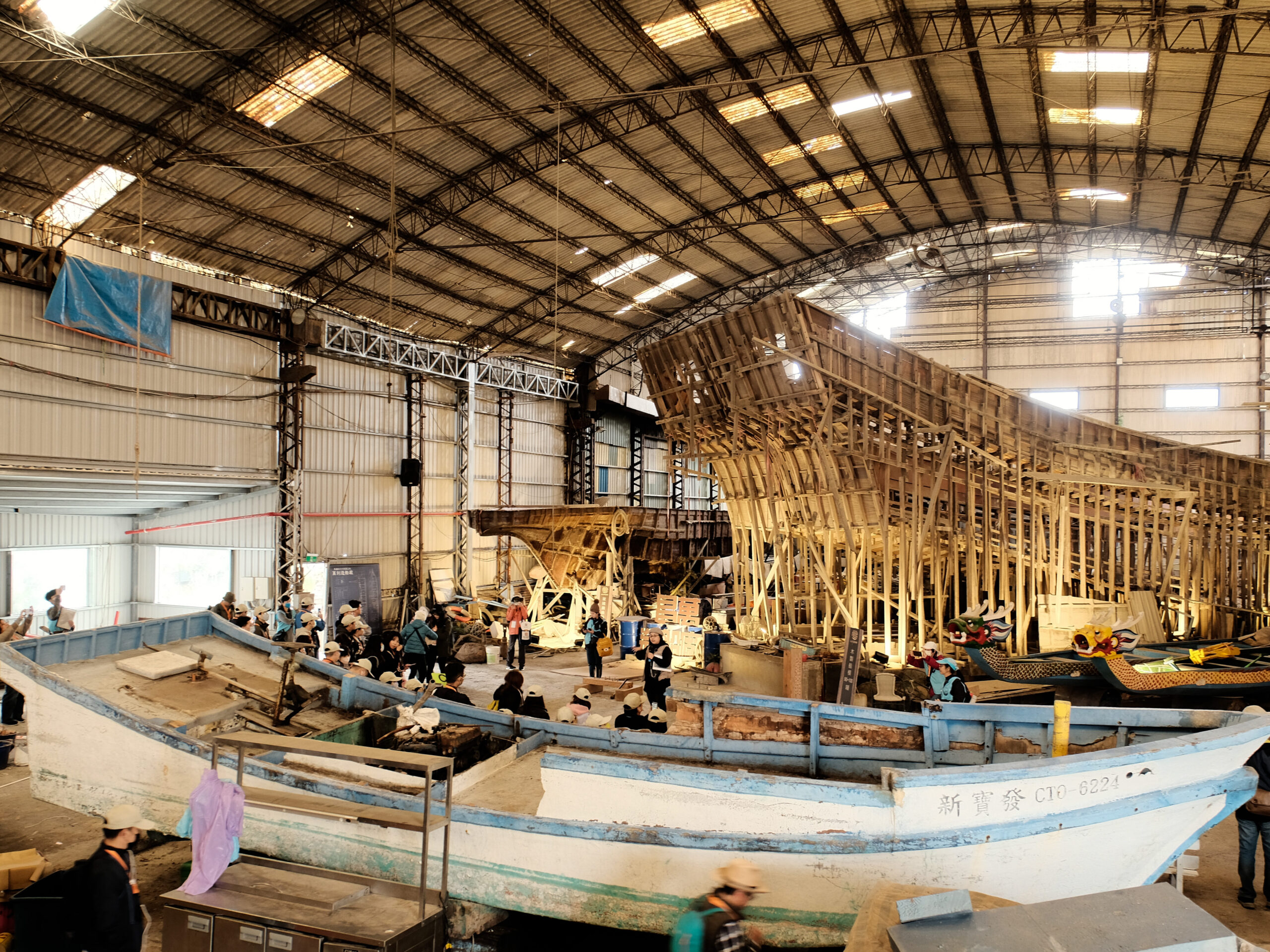 全場⼀陣驚呼!當穿過鐵⽪窄⾨,印入眼簾的竟是數層樓⾼的⼤型⽊頭船模!儘管許多⼈知道南寮以漁港出名,但眼⾒規模龐⼤的五代造船廠屹立,仍讓所有⼈驚訝。在此,⼤夥不只領略南寮造船歷史,也體驗昔⽇造船師傅的基本功-打釘⼦,動作看似簡單,但沈甸甸的錘⼦握在⼿,光要打中就要技術,是貨真價實的南寮體驗。