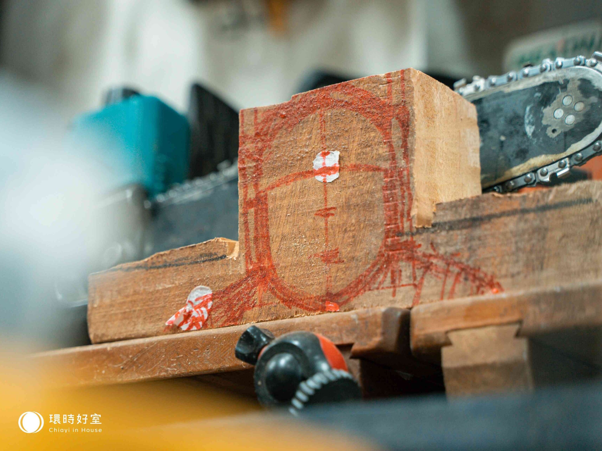 在木塊上打出草稿,將平面雕琢成立體。(島內散步攝)