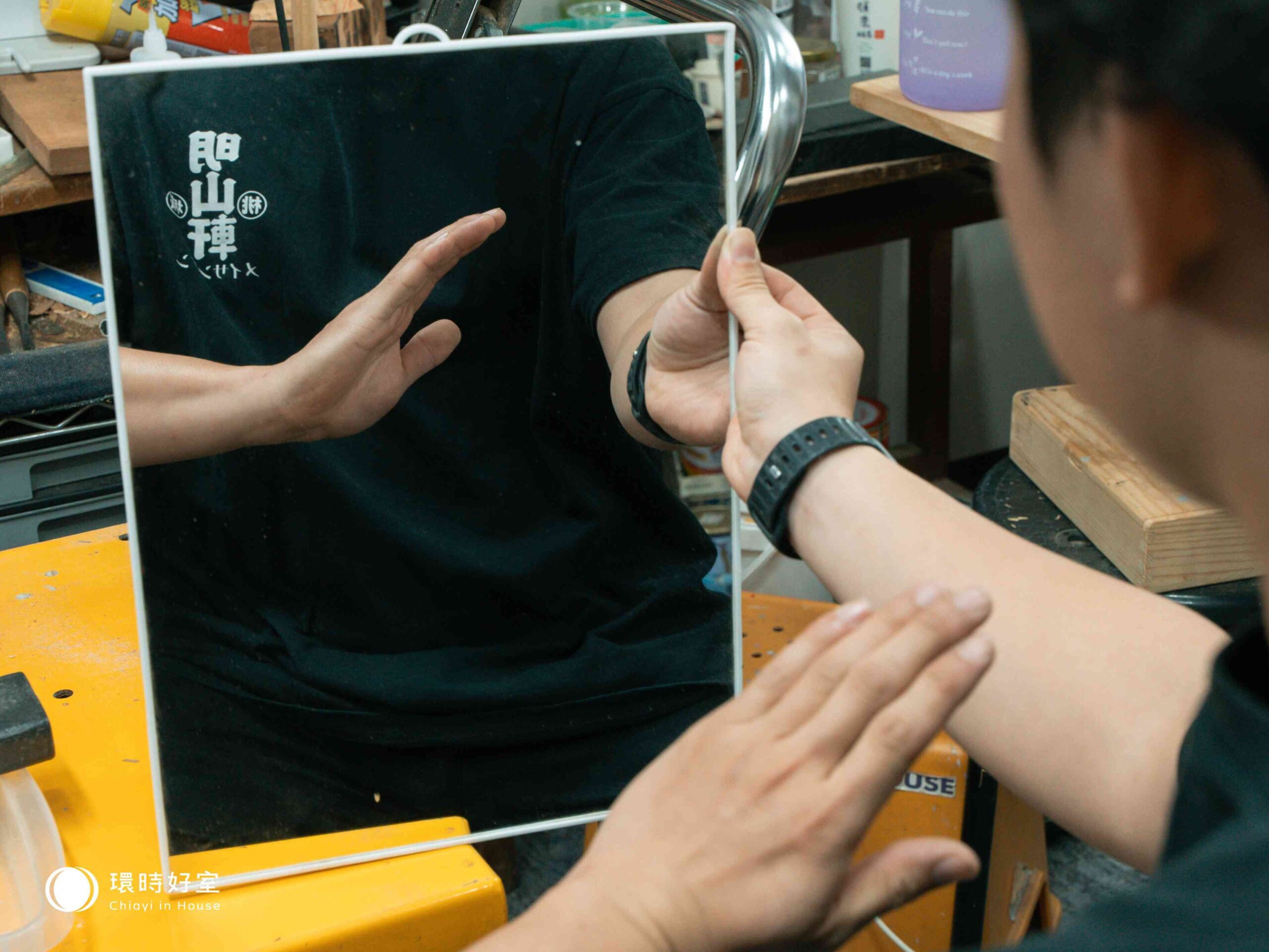 設計的過程中也會在鏡中揣摩各種不同的動作。(島內散步攝)