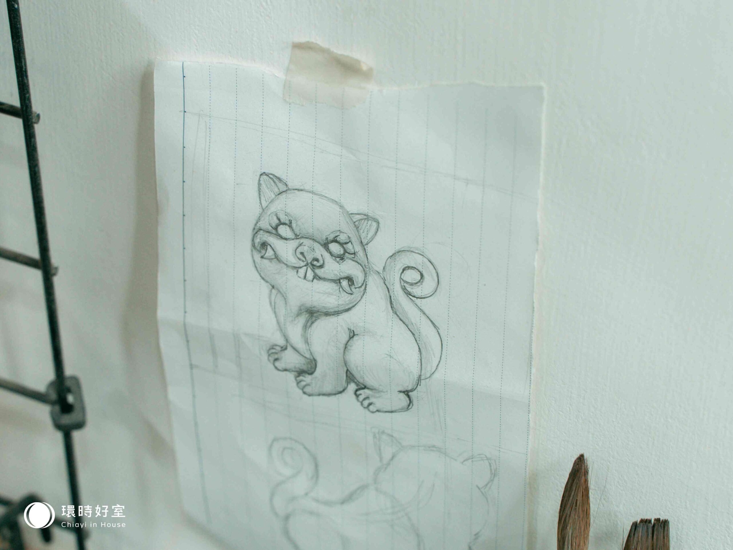 牆上貼著細緻的設計手稿。(島內散步攝)