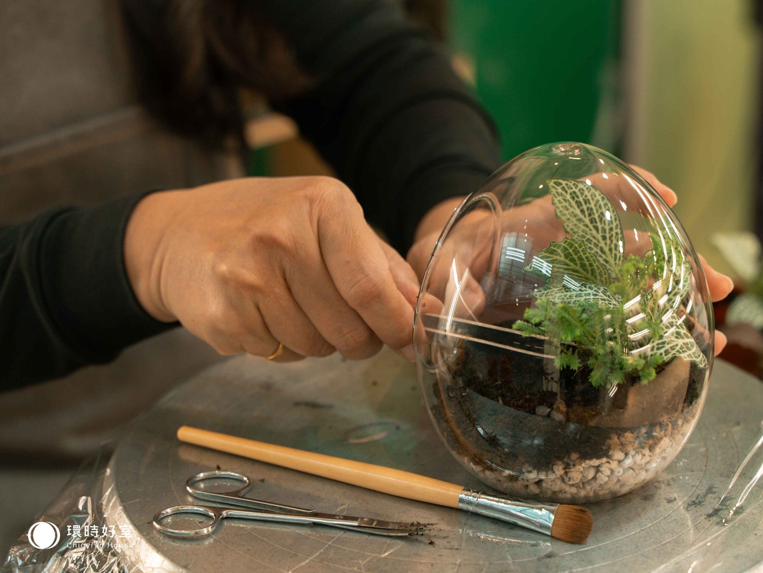 除了老闆自身的藝術展現,花蘚趣也會迎合客人的美感要求,提供客製化的服務。老闆發現很多客人將成品帶回家後,也會自行調整造景,因此花蘚趣推出DIY課程,讓大家親自體驗創作一個微小世界的樂趣。