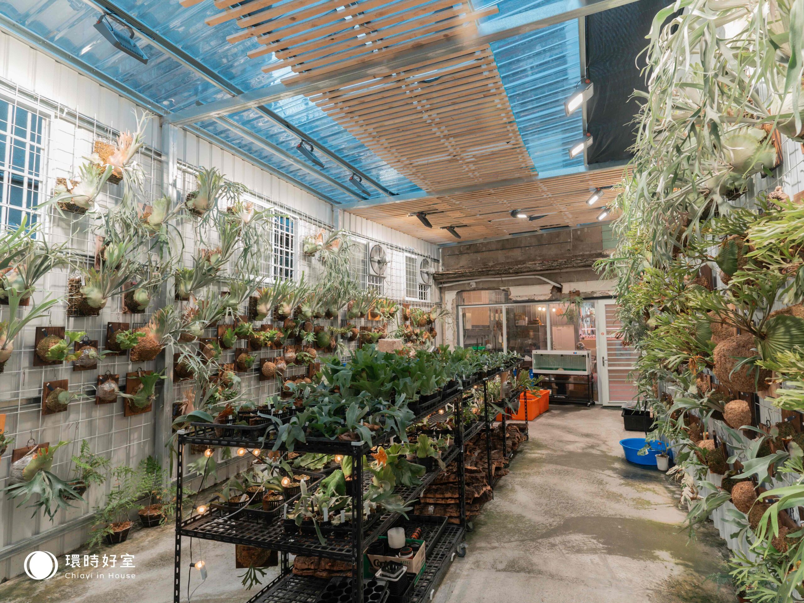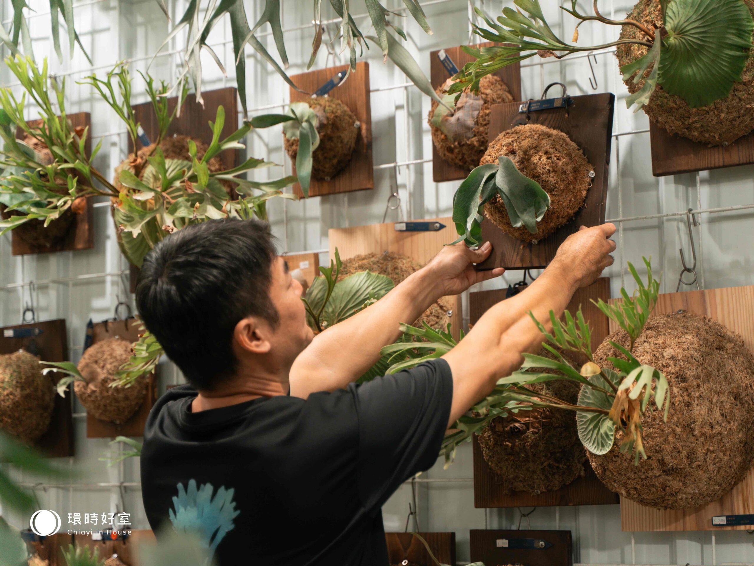 「其實鹿角蕨沒有想像中的嬌貴喔!」老闆分享,只要在半日照和通風的半室內空間,如騎樓或陽台這樣的環境,再以平鋪的方式依據季節的冷暖而採取不同的澆水原則,就能妥善地照顧這些植物。