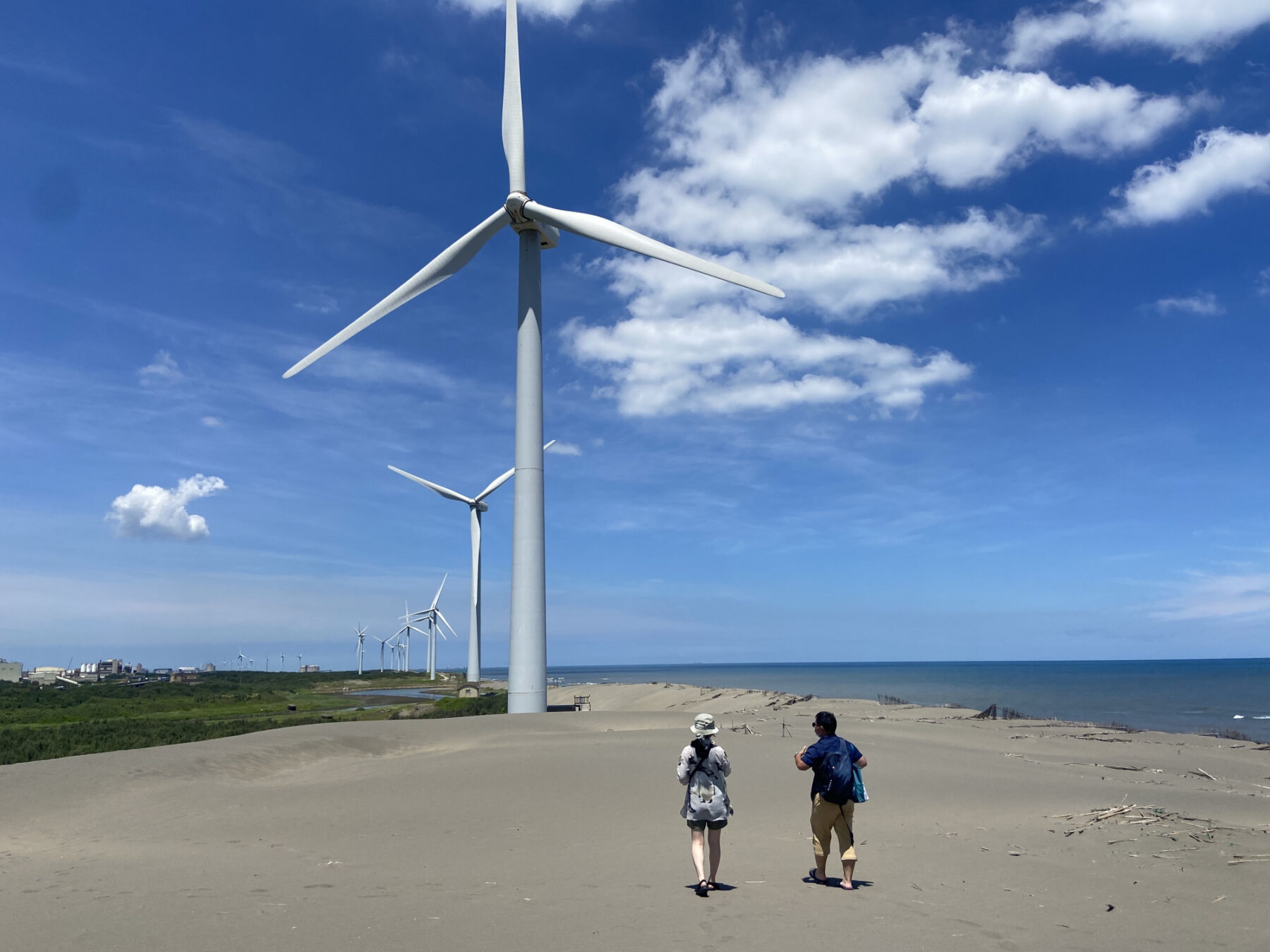 一起走上沙丘高點,向北看是觀音山、八里,望南看去則是一排壯觀的風力發電機的遼闊視野。風與沙的交互作用,讓我們腳下踏的沙丘無時無刻都在變化樣貌,在壯麗的景色下,同時聽到故事、海岸環境的演變,走在沙丘上不時冒出頭的竹枝尖端,其實就是沙丘過往的見證者。