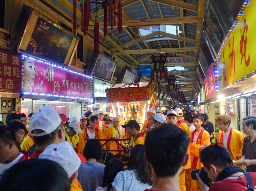 晚上隊伍會穿梭在⼈聲鼎沸的⻄⾨町徒步區,和現代的⻄⾨町商圈街景形成強烈的對比。也會經過萬華重要信仰之⼀的的艋舺清⽔巖祖師廟及⻄⾨町媽祖廟,有機會在這兩間廟前⼀睹青⼭王出巡獨特的「跑轎」儀式。