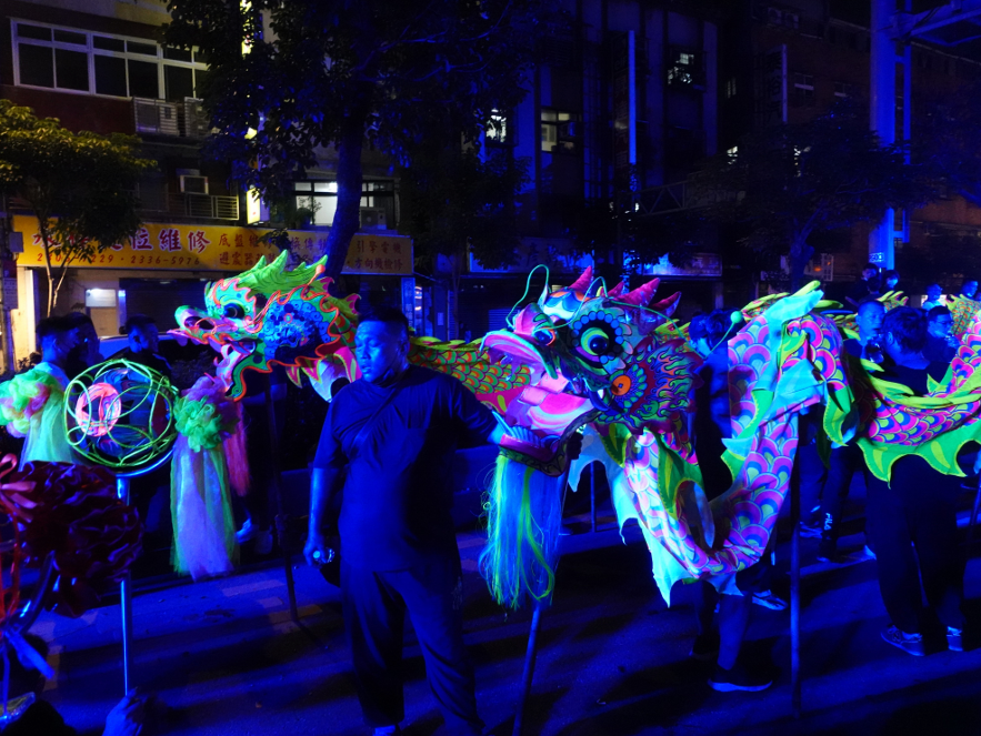 晚上隊伍會向東園⼀帶前進,能感受商圈、住宅區⼀帶居⺠準備香案引頸期盼青⼭王到來的氣氛,也有機會參觀⼀年⼀度出動的堀江町⾶龍團的夜光龍。