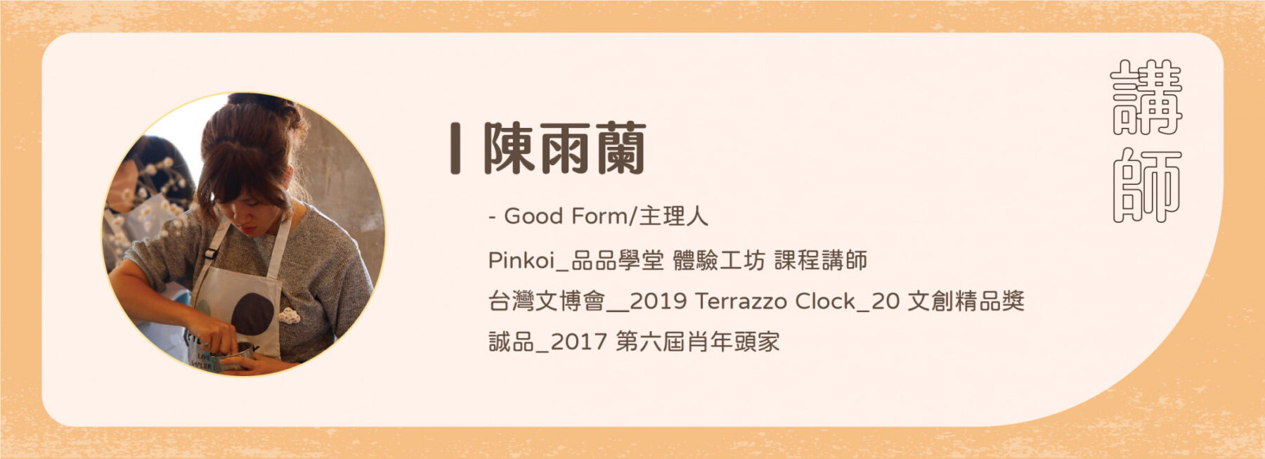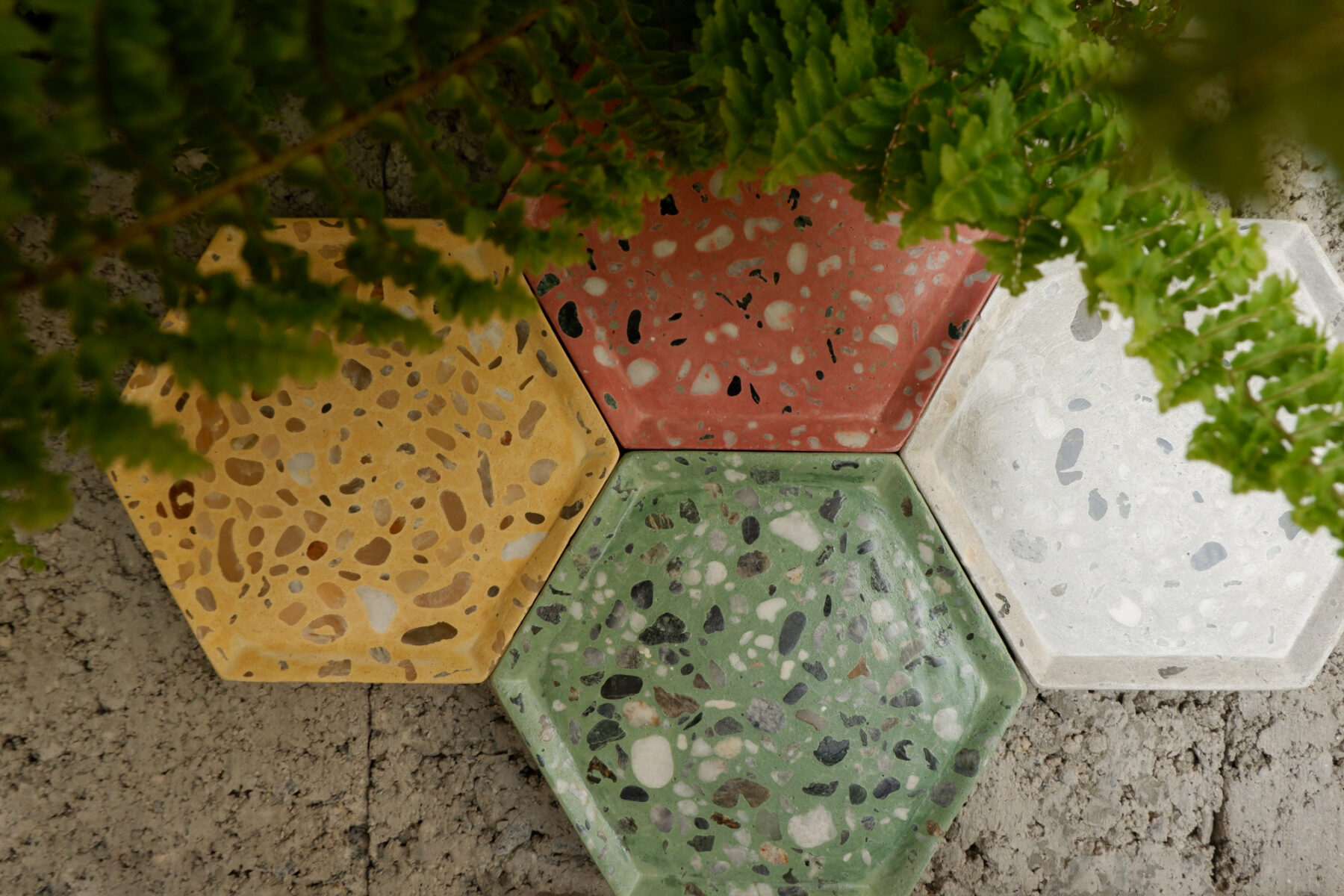 Good Form 主理⼈雨蘭畢業後對磨⽯⼦非常感興趣,原先找師傅學習,卻被打槍認為女⽣無法做粗⼯,也因為師⽗的打槍開啟了磨⽯⼦的系列計畫(Terrazzo plan·磨⽯計畫),雨蘭開始⾃⼰上網學習,並重新改良設計,使這項⼯藝從⼤型堅固冰冷的地板縮⼩並轉化成⽣活的器物。