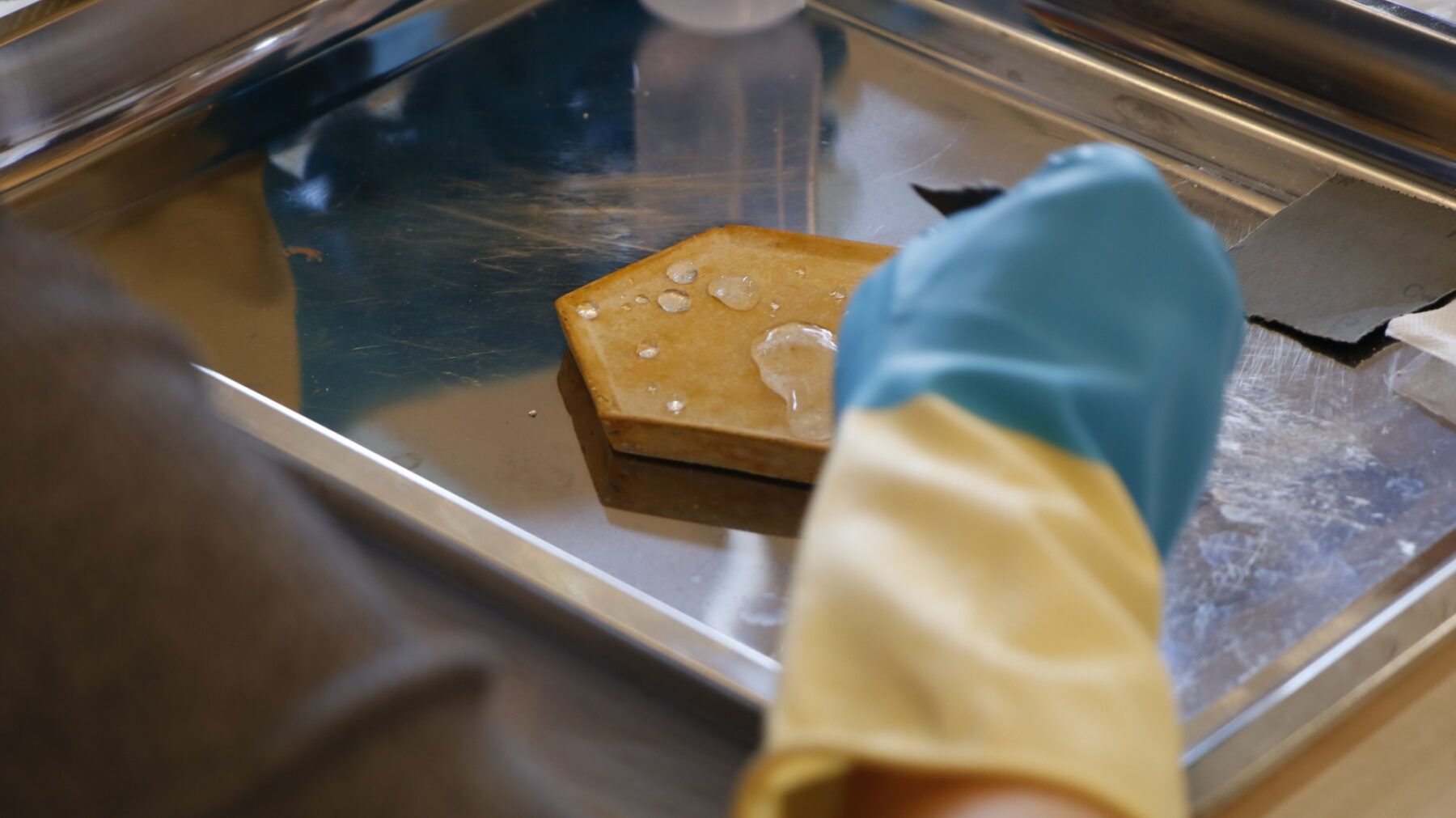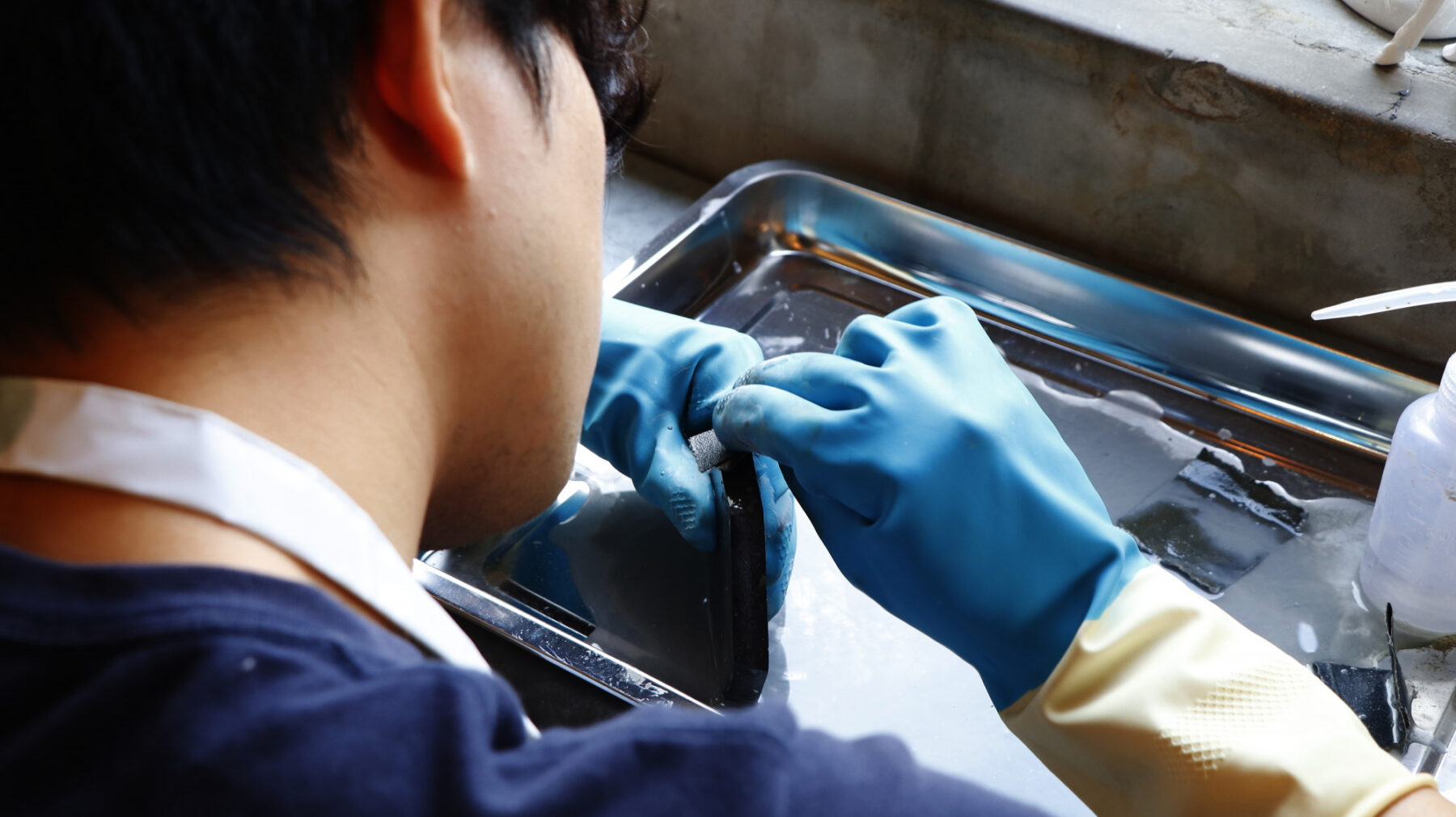 製作⼀款磨⽯⼦,不僅僅是將泥漿灌製、脫模養護如此簡單,過程須不斷反覆的研磨佐以⽔流的掏洗,才能讓表⾯產⽣萬花筒般的紋理,製作出⼿感圓滑冰涼的磨⽯⼦。