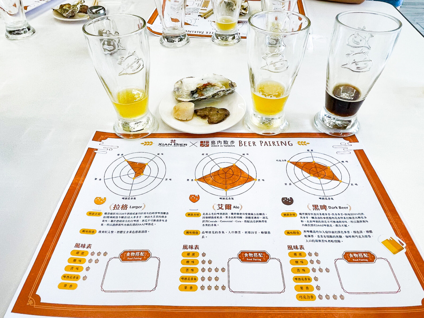 再以啤酒品評卡,⼀次認識拉格、艾爾、⿊啤的各有滋味!若您只喝⼀杯⽽嚐不出差異,廠家也豪氣提供無限暢飲,成為⼀⽇啤酒品評師!品酒之餘,廠家更準備現烤伊比利豬、⽣蠔、⼲⾙,以及在地養殖、善⽤九降風風乾的⼀⼝烏⿂⼦佐酒款待。當⼀⼝在地烏⿂⼦、⼀⼝當地精釀,香⼭味道⾃然深植⼈⼼。