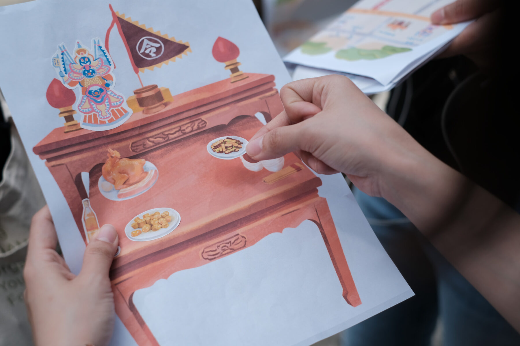 透過遊戲設計,我們將帶領⼤⼩朋友⼀起走訪老街,聽店家介紹商品、祭祀的傳統⽂化。