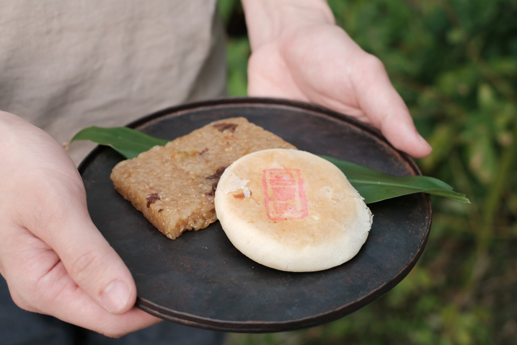⾏程附贈:新⽵走走紀念品-⼿⼯柿染布⽅⼱及在地店家伴⼿禮-呂順興餅舖蕃薯餅與甜米糕