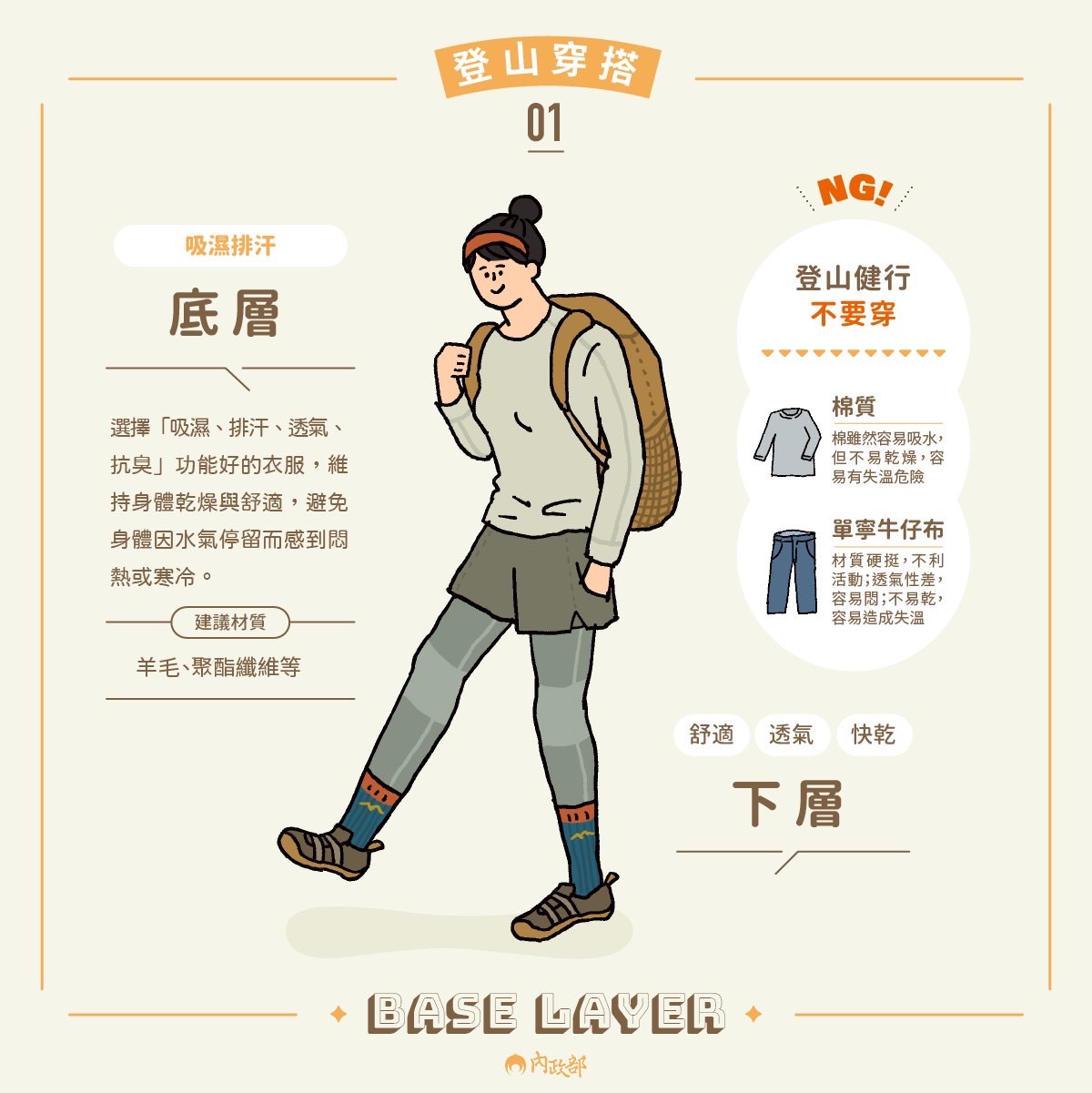 ⼀、底層:穿在最裡⾯,與⾝體最直接接觸,必須選擇有「吸濕、排汗、透氣、抗臭」的衣服,才能維持⾝體的乾燥與舒適。