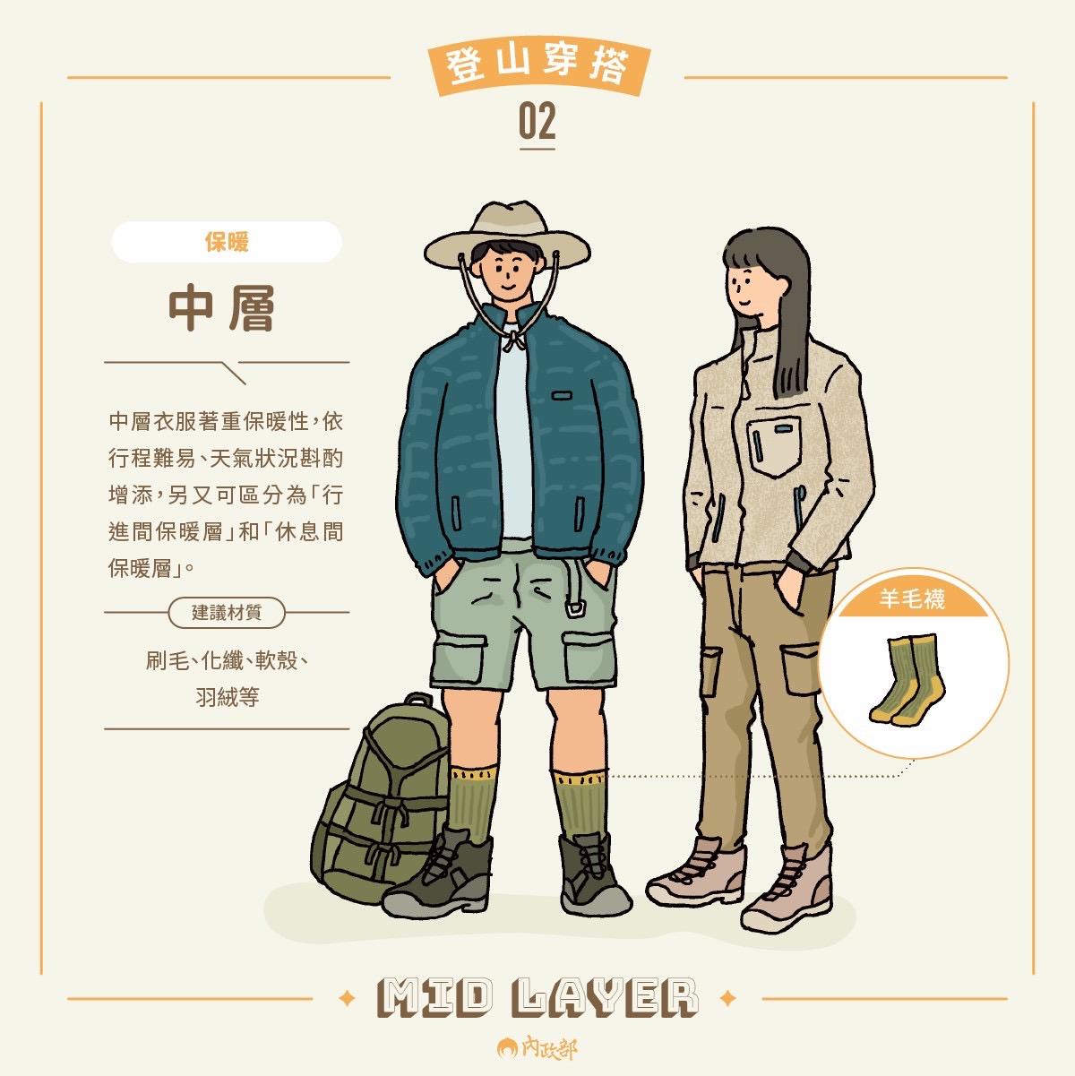 建議以洋蔥式穿搭,分為「底層、中層、外層」3 個部分,它們各⾃有不同的材質及功能。