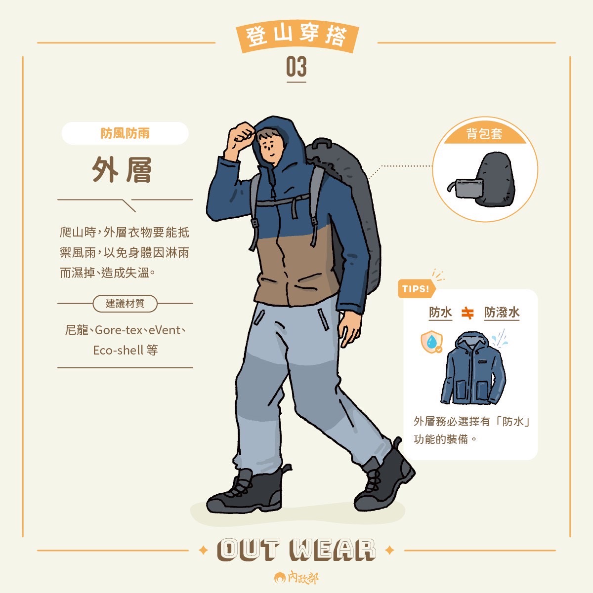 三、外層:除了最重要的「防風、防⽔」功能,⾝為穿在最外層的衣服,也肩負著讓其他⼈說出「很好看耶」的任務。