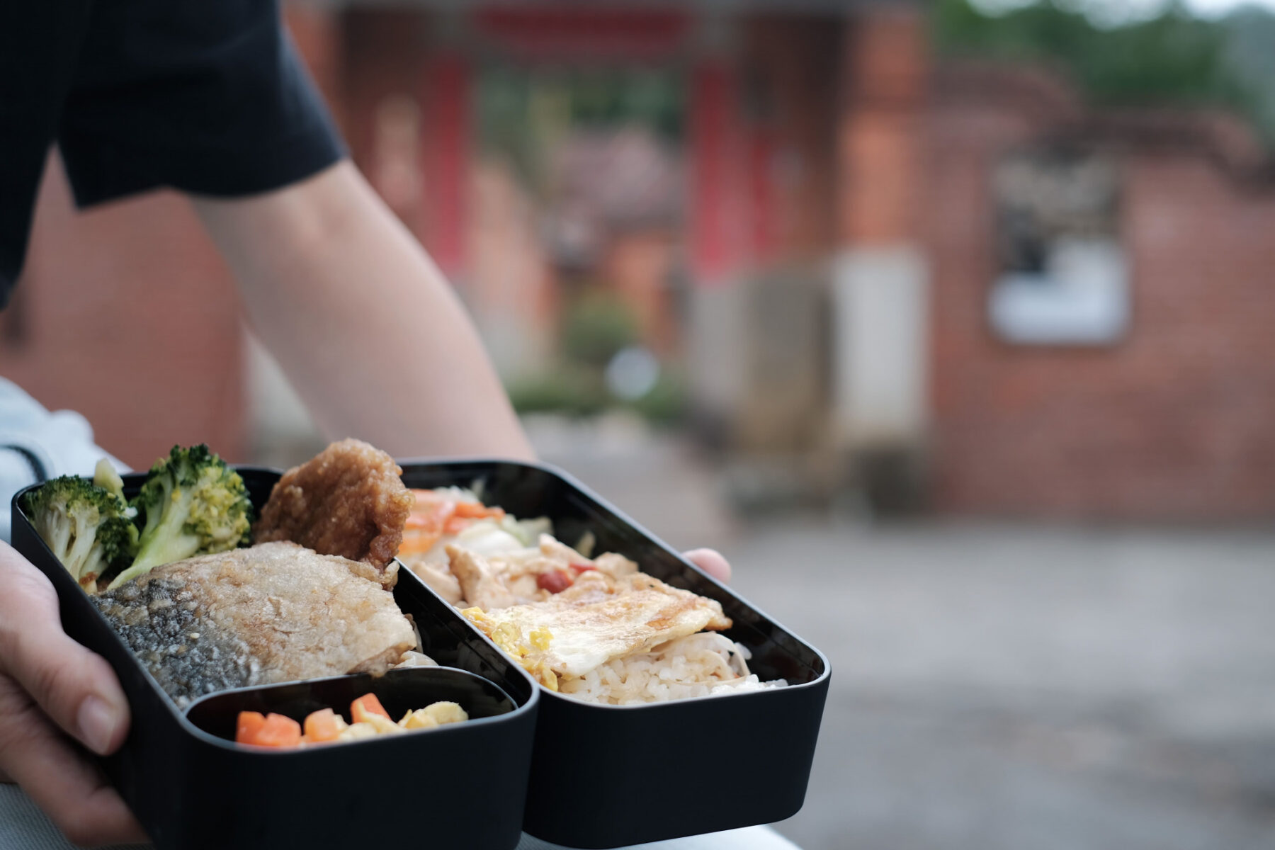 在院埕中享⽤當季食材製作的「割稻飯便當」,體驗農忙時期鄉⾥間的互助美好⼈情。