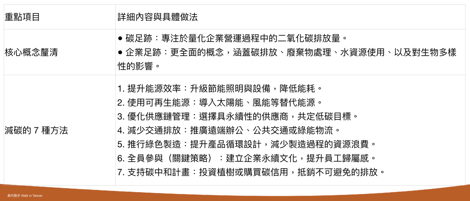 碳足跡聚焦於企業在運營過程中直接或間接產生的二氧化碳排放量,目標是量化並逐步減少環境影響。而企業足跡是一個更全面的概念,包括: