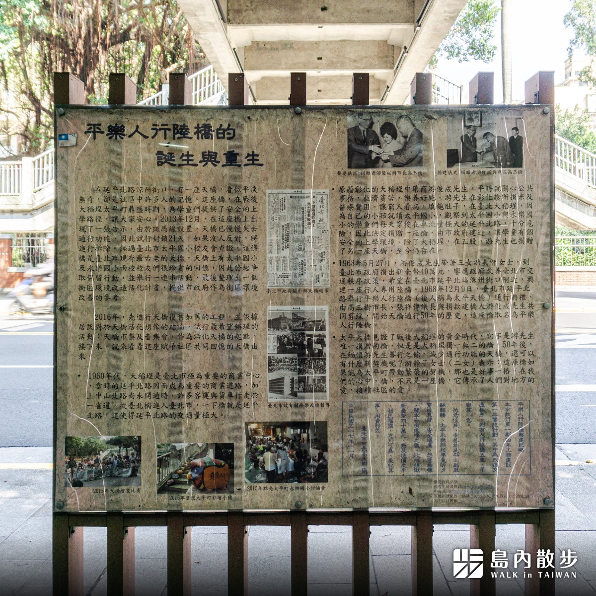 過去天橋是車本時代的產物,行人必須讓車先走,於是各地興建天橋、地下道,今日觀念已改為人本價值,於是政府開始逐漸拆除天橋、地下道,原訂2014年拆除平樂天橋,我們才注意到平樂天橋的時代意義,發掘游俊成先生的捐贈事蹟、大稻埕人的回憶,找出橋下當初竣工的牌匾,以及平樂天橋是目前台北市現存最古老的天橋。
