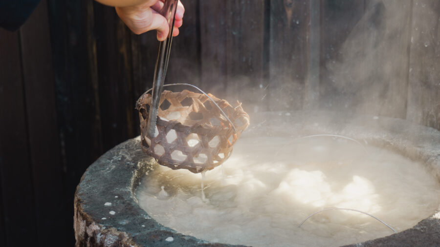 在地熱谷周邊,除了用手泉親近溫泉,還有一個獨特的體驗方法——自己的溫泉蛋自己煮!將竹簍放入活躍的泉水中,在蒸騰的熱氣中一起期待著。