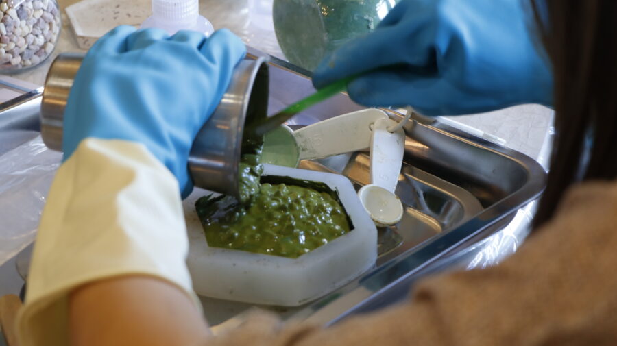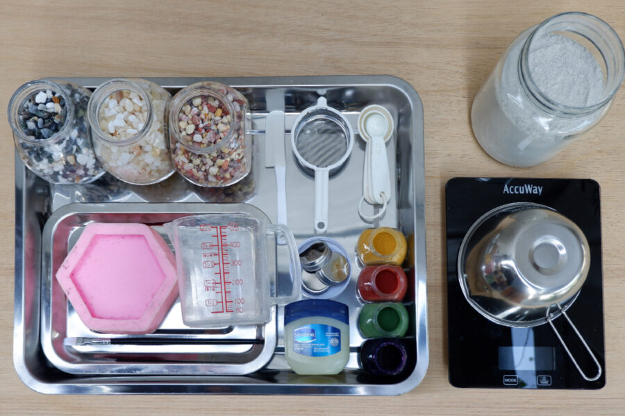 製作一款磨石子,不僅僅是將泥漿灌製、脫模養護如此簡單,過程須不斷反覆的研磨佐以水流的掏洗,才能讓表面產生萬花筒般的紋理,製作出手感圓滑冰涼的磨石子。