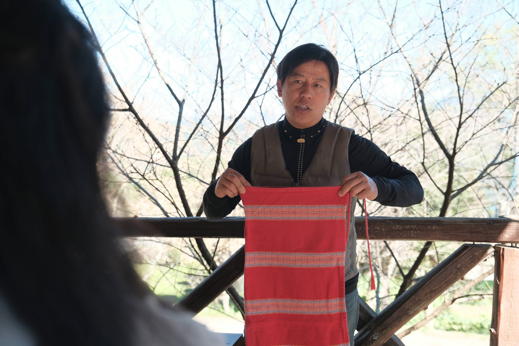 竹製的家屋佇立山頭,屋子中心燃著暖暖的火塘,這是每一座原住民家屋都一定會有配備,這不只是烹飪的地方,更是家人團聚、分享故事、傳承文化的場域,我們一起套上不同顏色的泰雅傳統編織披肩,聽農場主人介紹關於披肩色彩涵義。