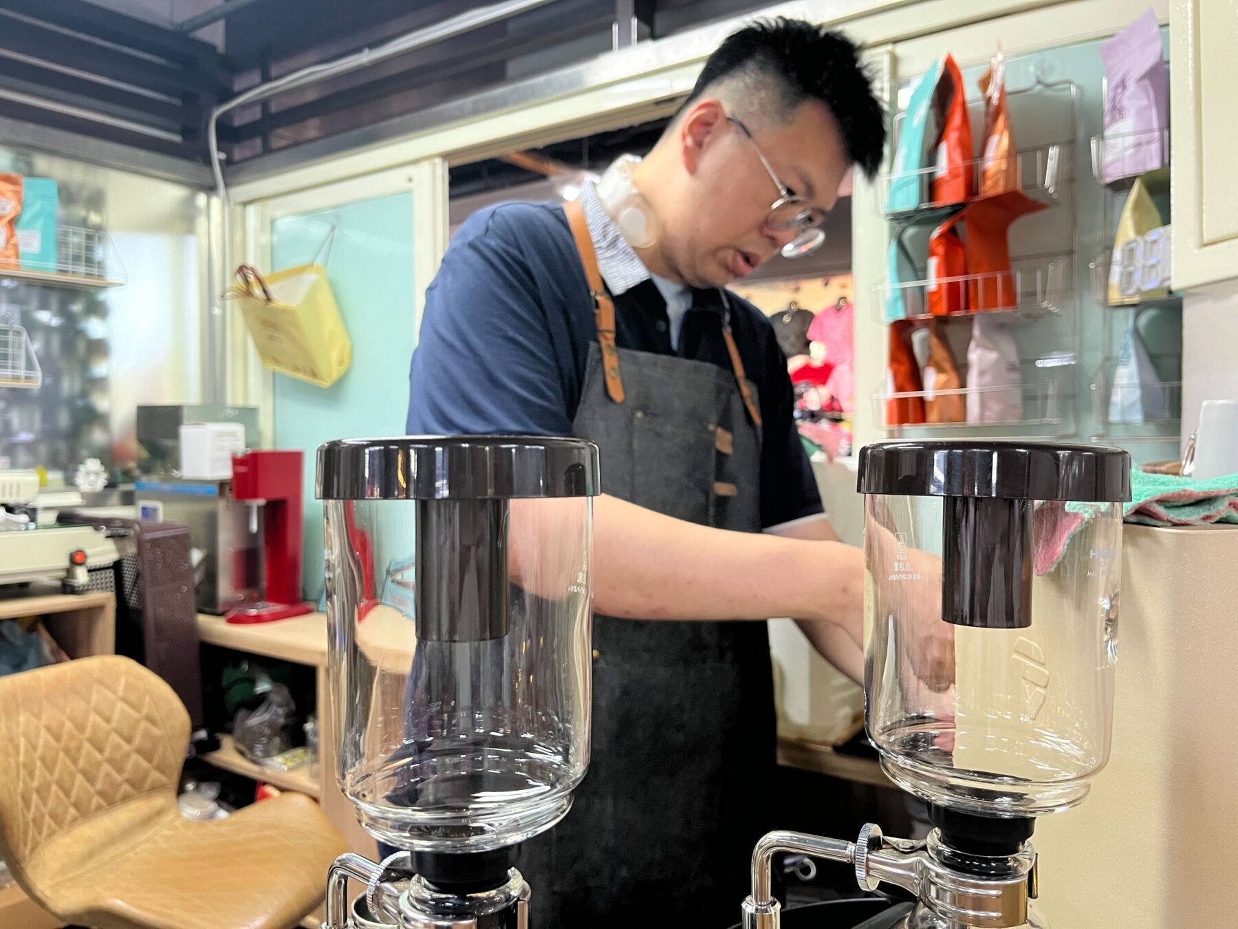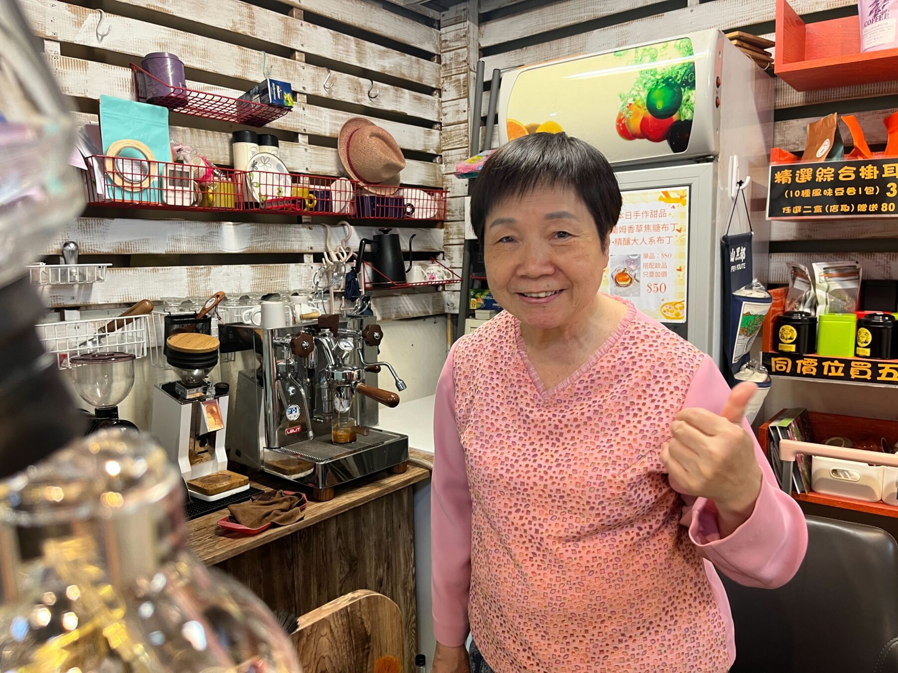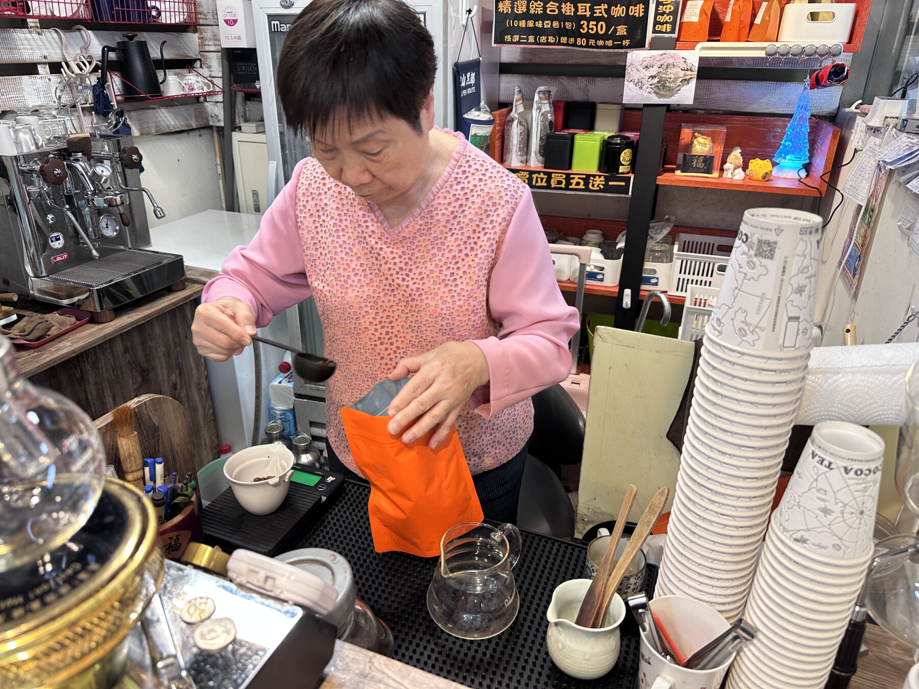 一開始,李老闆很擔心李阿嬤會被熱水燙到,總是在一旁細心叮嚀,提醒她該注意哪些地方。李阿嬤則自信地和我們分享,她是如何一步步學會煮咖啡、操作器具的過程,還笑著說自己對經營咖啡店比兒子還有熱忱。