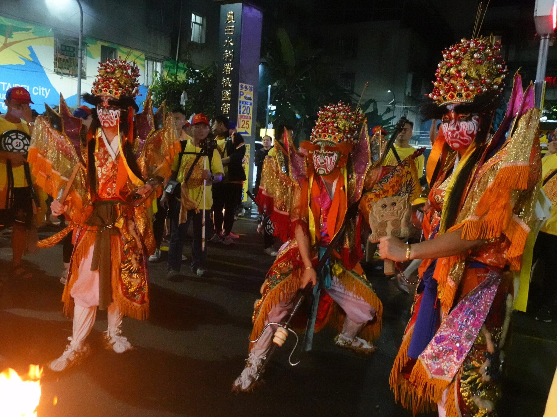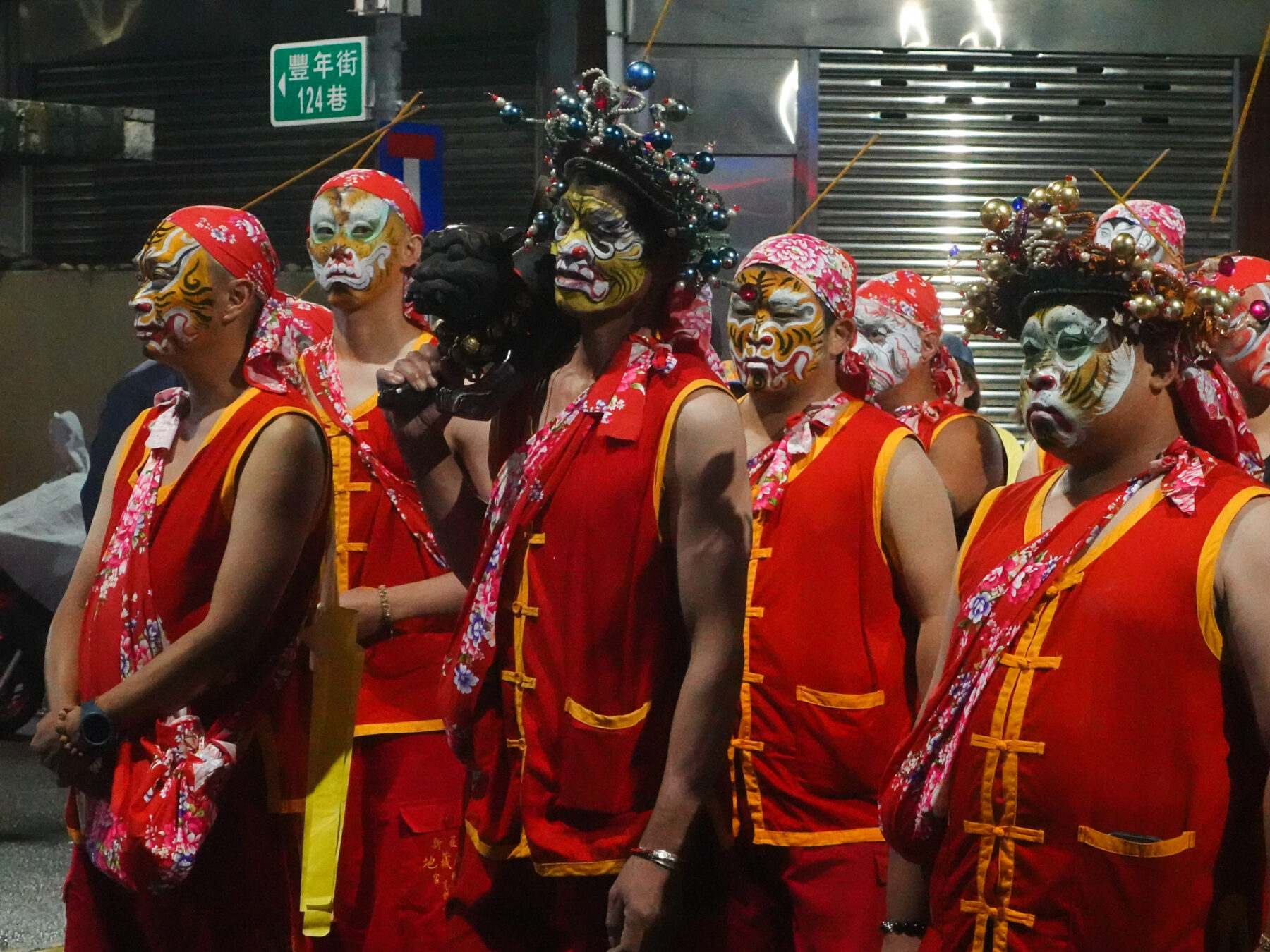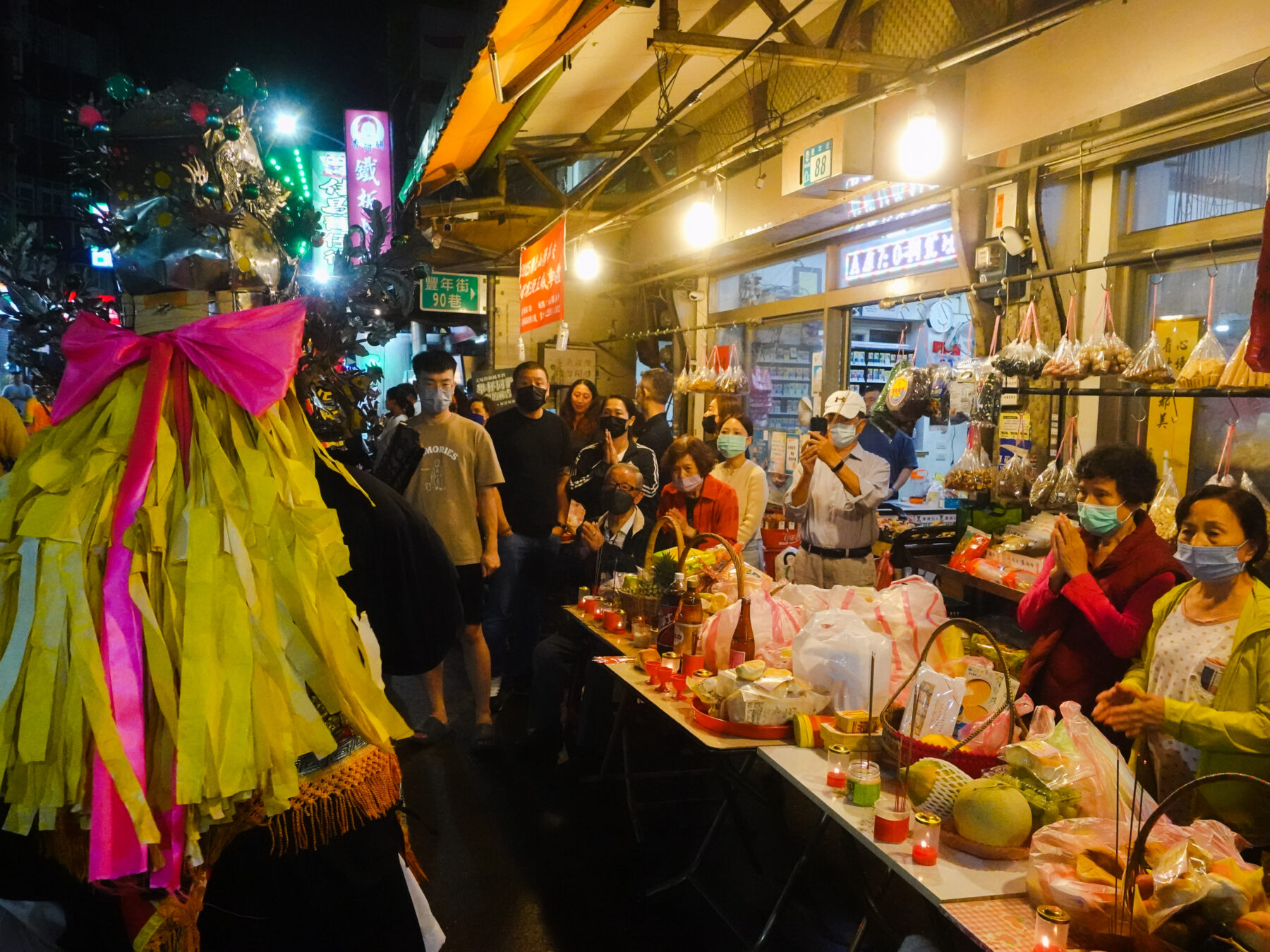 暗訪的夜晚華燈初上,我們走過豐年街,放眼望去街道兩旁,是綿延不絕的案桌,家家戶戶總動員,在一旁寒喧話家常,等待隊伍的到來。而福壽街一帶,也吸引不少居民在小吃店前駐足圍觀陣頭表演,整條街道熱鬧非凡,水洩不通。
