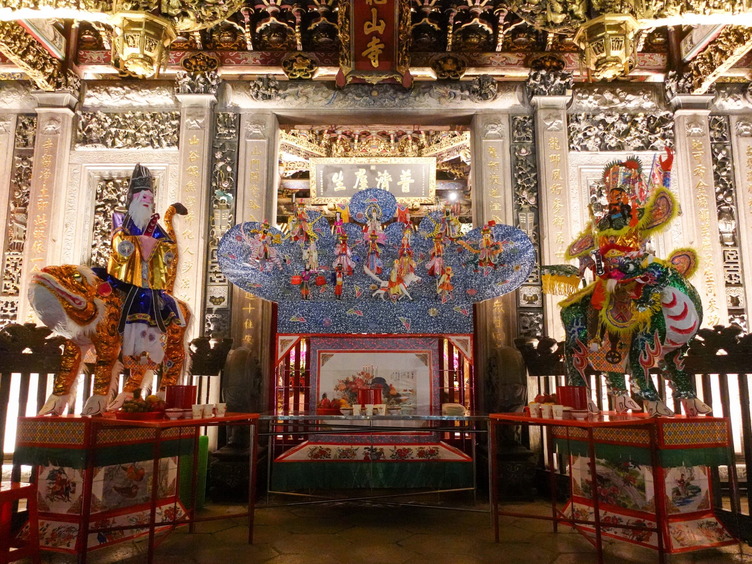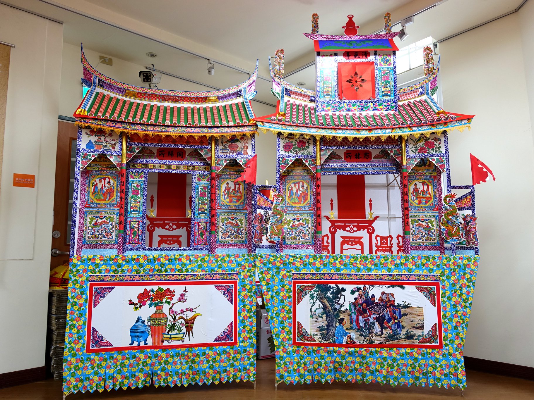 為了節省空間,也避免碰撞造成損害,會將部分作品吊掛在牆壁上收納,農曆六、七月的新興糊紙牆上常常掛著水燈的屋頂或大士爺,好似無重力空間。 photo credit:史筱薇