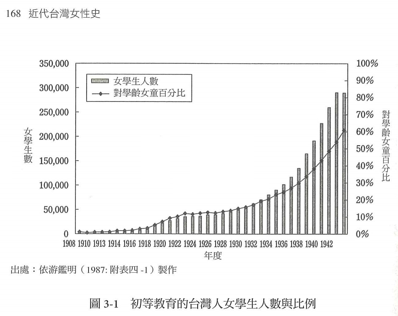 初等教育的台灣人女學生人數與比例(來源:近代台灣女性史第168頁/作者洪郁如)