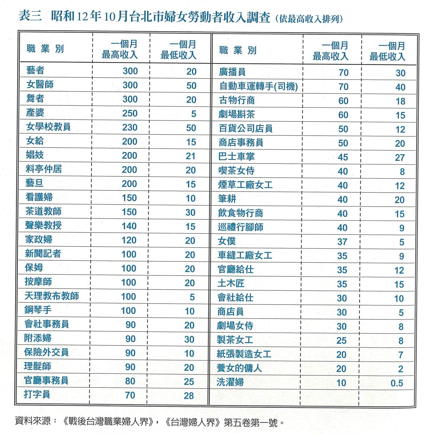 1937年台北市婦女勞動者收入調查(來源:大稻埕查某人地圖第91頁/作者陳惠雯)
