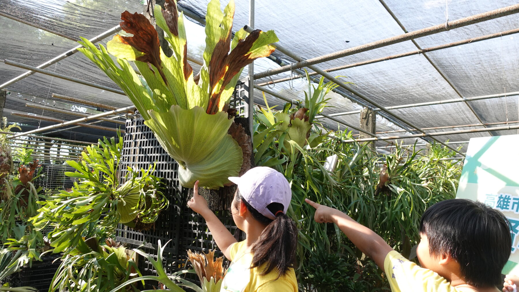 走進小院,迎面而來的是搖著尾巴的白色米克斯犬,接著是一排又一排掛滿鹿角蕨的架子。孩子們興奮地追著問:「這個長得像大象耳朵的是什麼?」、「為什麼它叫女王?」鹿角蕨垂掛下來的葉子像是在揮手,彷彿在歡迎遠道而來的客人。