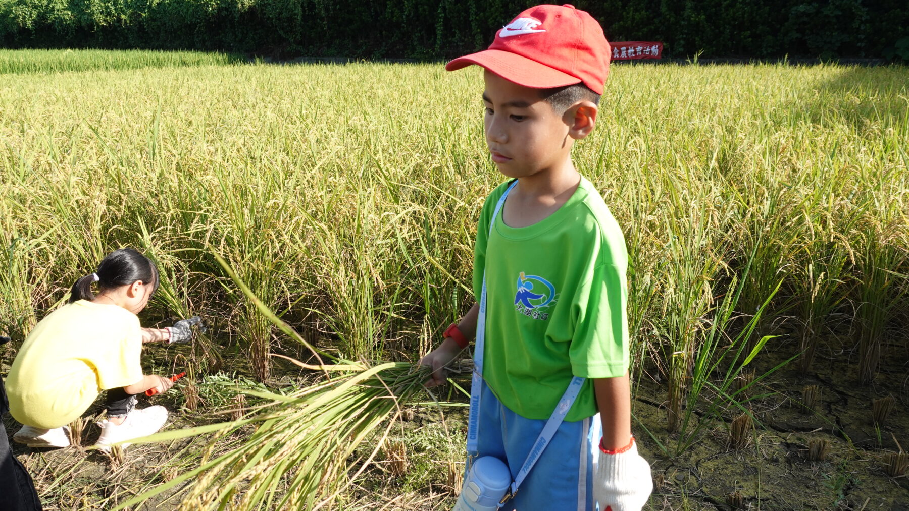 金黃色的稻穗隨風搖曳,一粒粒稻穀沉甸甸地垂下了頭。看著這片準備收割的稻田,彷彿能聞到電鍋裡米飯的香氣。大湖村的孩子真幸福——每天睜開眼就能看到稻浪翻騰的風景。