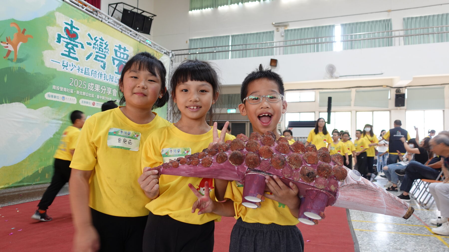 臺中頭汴社區的孩子們自信展示手作的穿山甲模型