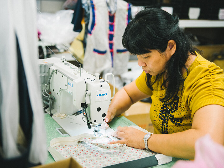 大愛縫紉工作坊是由移居杉林區的婦女組成的合作社,在莫拉克風災後,齊心協力、一步一腳印從頭開始學習,從不懂車縫到接單製作,踏踏實實的為新生活拼搏。帶著取自土地、回饋在地的初衷,印花樂也和大愛縫紉開始合作,從自有商品到客製案件,從各面向與媽媽們相互學習成長。