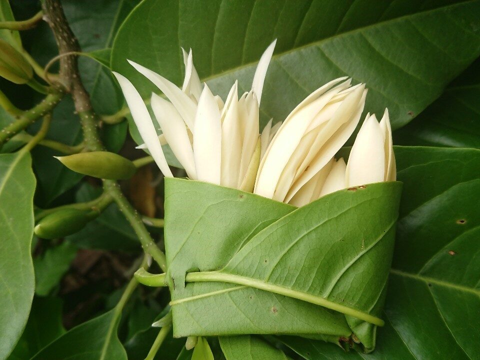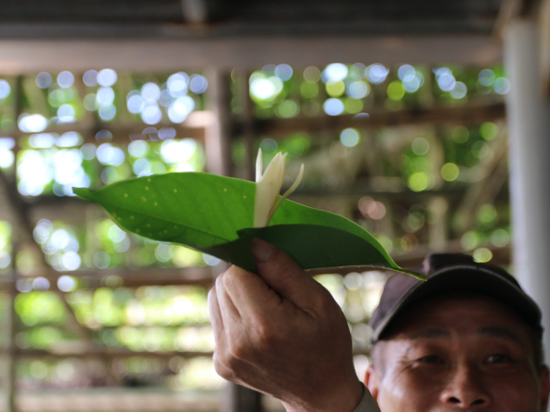 為了不讓手因為接觸花而導致過快變色凋零,採收前楊大哥會教我們用玉蘭花樹的枝葉來做一個小盒,採完就可以放進去。