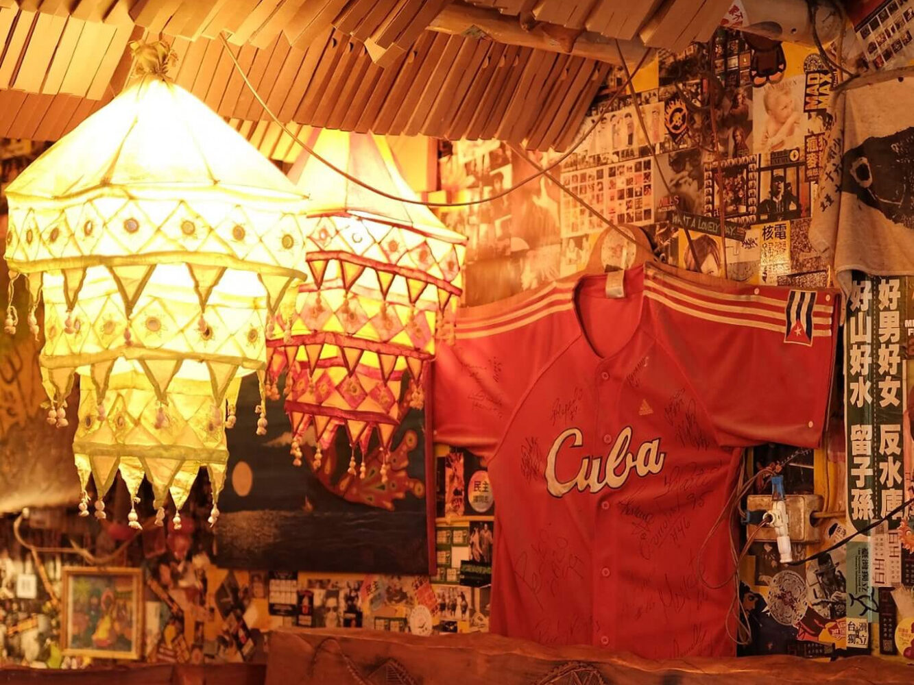 2004年前後,南寮出身的老闆阿賀租下店面,著手改造荒廢許久的雜貨店空屋,當中佈置起周遊列國帶回的木雕藝術與最喜愛的燈籠,也存放屬於台灣的記憶,像是紅色古巴隊球衣,那是2001年台灣首次舉辦世界杯棒球賽,古巴奪冠後的全隊簽名球衣,不只是古巴球隊的公益募資,更是台灣棒球迷的共同回憶。一旁還有座新竹製造的老火爐,對抗冬日冷冽海風。這些老物,不只在海屋留下故事,更永續利用。