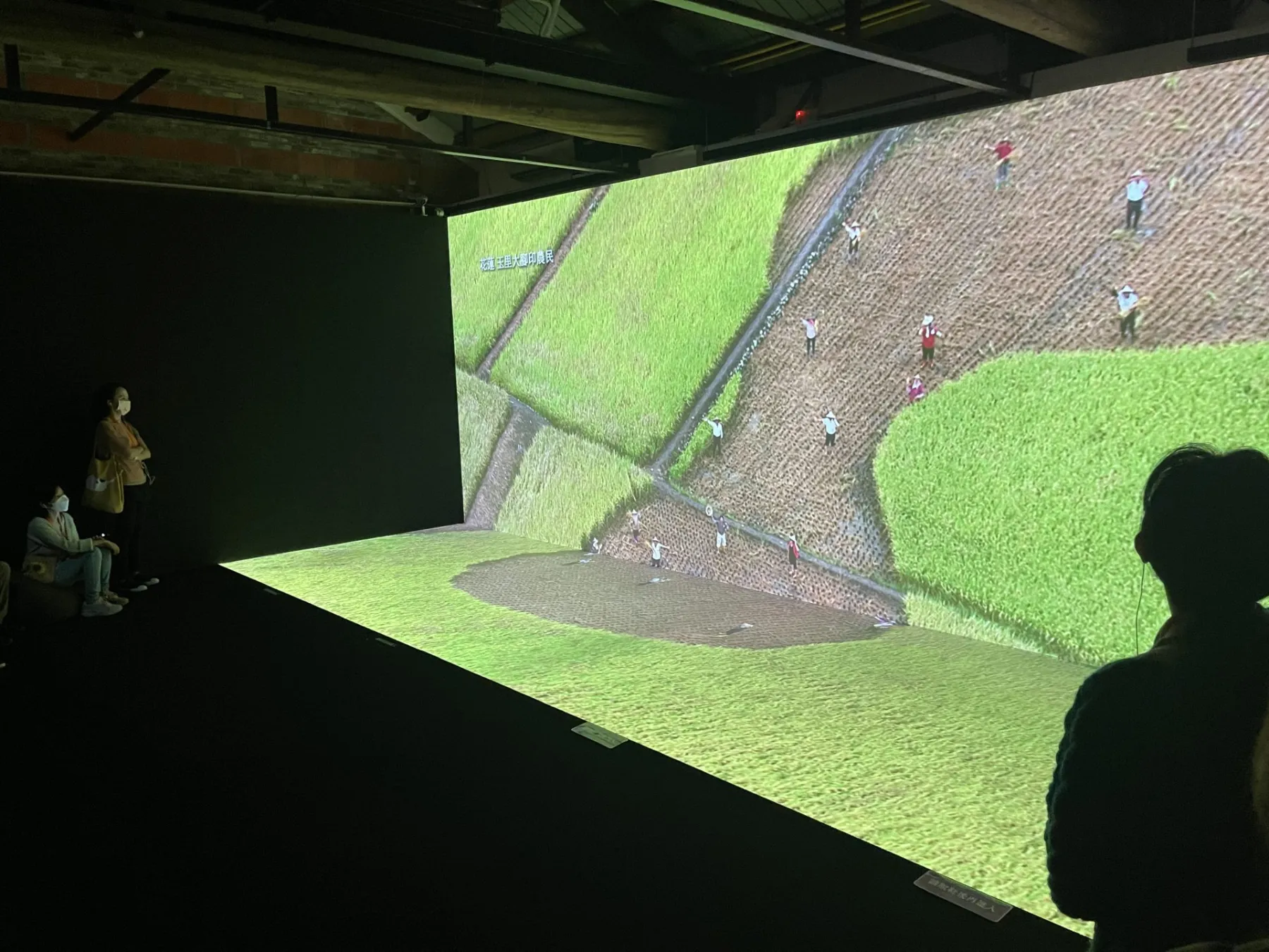 接著以沈浸式劇場的 L 型投影,讓人站在河流中感受空間錯置感,一旁以河流調色盤的色塊概念,顏色為軸讓我們看到污染下、濕地、颱風後等各種形式的河流,以及人類與河流相處所衍生出的各種樣貌、景觀。