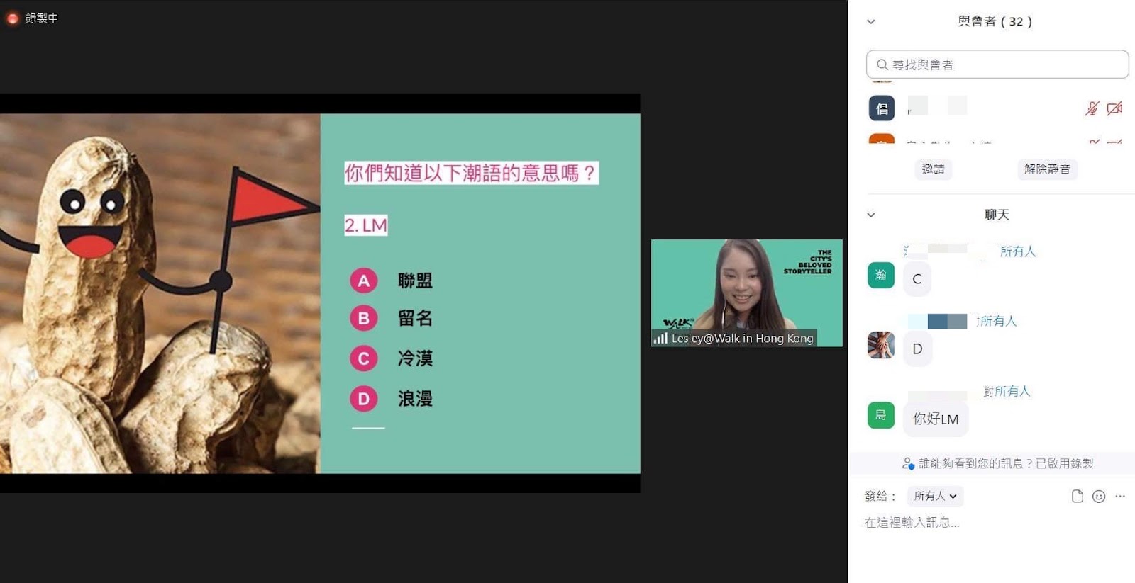 你聽過港式「潮語」嗎?你心中有過念念不忘的「港片男神或女神」嗎?香港警匪片、藝術電影多年來風靡全球,五光十色的香港街區,更讓人流連忘返。導覽員將這些元素融合其中,設計趣味問答:「蘇絲黃在酒吧工作,香港除了灣仔的酒吧區,還有哪些著名酒吧區?」「《嚦咕嚦咕新年財》的台詞『人品好牌品自然好』,因為劉德華變成香港潮語,台灣也有趣的潮語嗎?」「你聽過LM、世一、壞過凱婷?」,聊天室「刷一排留言」的搶答潮,和驚喜幸運轉盤,將氣氛炒到最high點,彷彿身歷其境。
