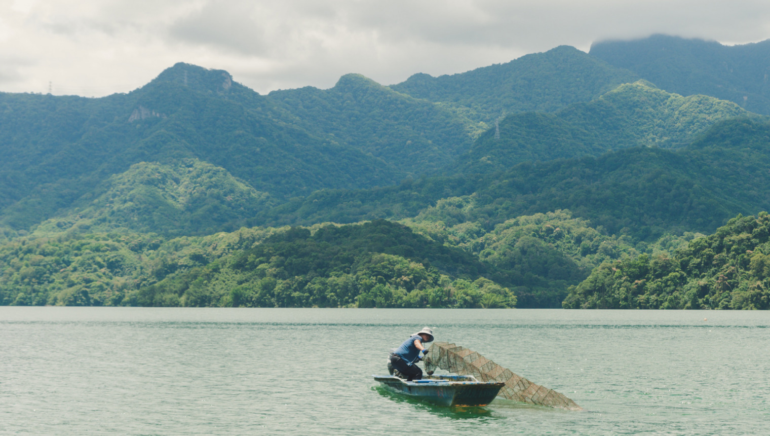 石門水庫的建成,讓世代務農的居⺠不得不改業,成了少數擁有合法水庫捕撈牌照的「漁 ⺠」。文翔乘著小艇捕撈碼頭邊事先撒下的漁網,透過撈起的魚隻介紹水庫魚隻和辨識魚隻的新鮮度。也說明距離碼頭不遠處的平靜水面那使用保特瓶作為標記的單層漁網,是如何捕捉符合永續原則的水庫魚隻。