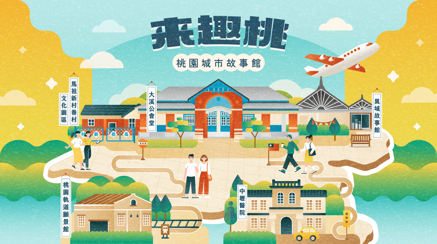 『來趣桃』為桃園以 桃園城市故事館 為主軸的旅行路線,以全桃園40間的故事館作為主題,每間故事館都分別代表桃園的多元文化特色,此次將以北桃園、南中壢和貫穿大桃園的眷村故事舉辦實體特色小旅行,看見桃園各族群文化交融的城市面貌。