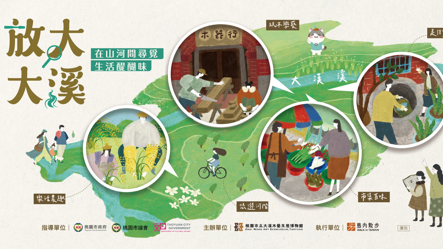 由 桃園市立大溪木藝生態博物館 攜手島內散步,推出 文化體驗遊程品牌 -以「放大大溪,在山河間尋覓生活醍醐味」為主題,推出獨家路線,結合生活、生產、生態,帶大家以有別於過去的視角,重新認識兼容並蓄、多元多彩的大溪生活樣貌。