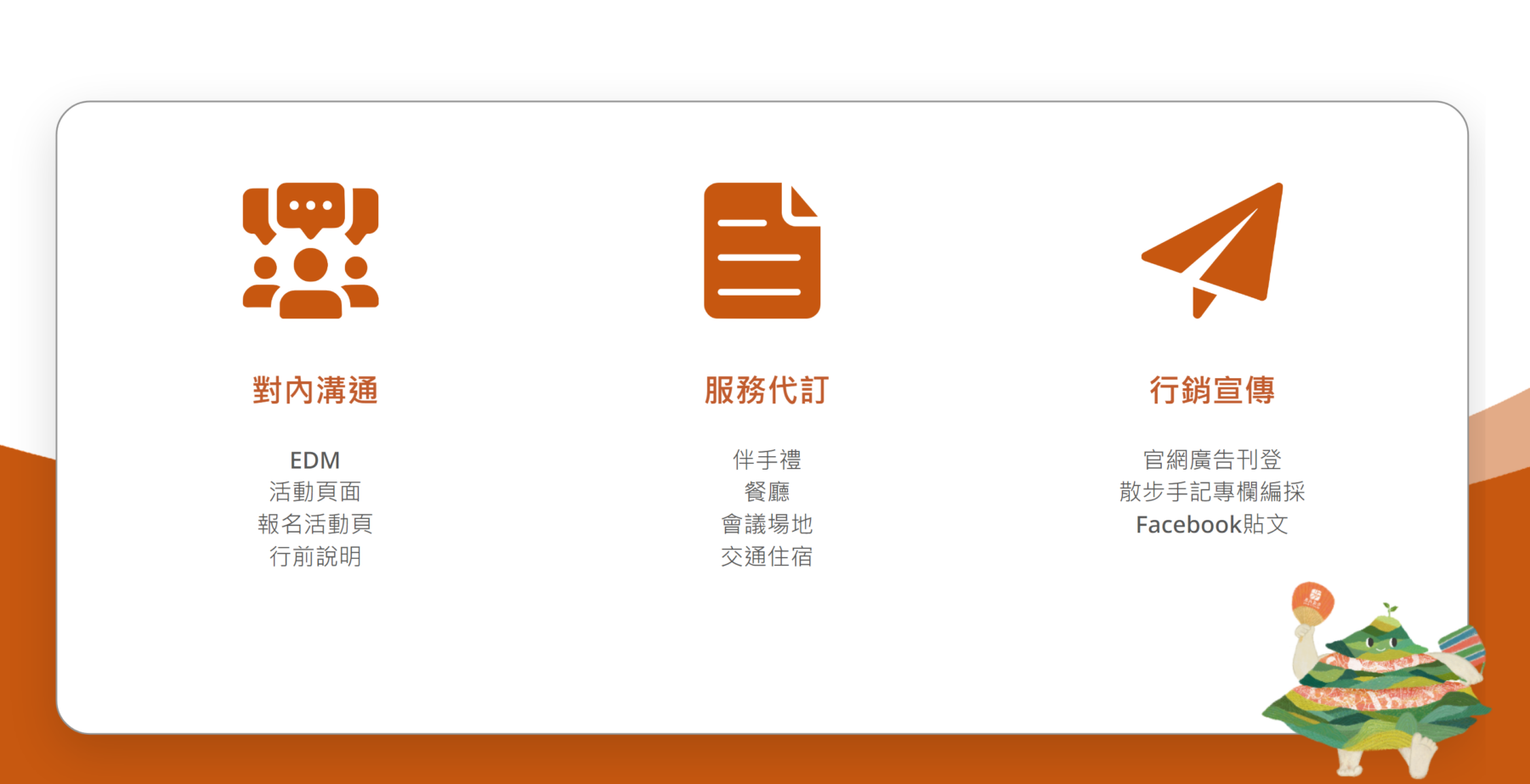 包含後台報名系統、官網遊程頁面上架、行銷宣傳等服務,