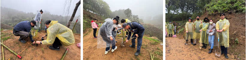 來賓們捲起袖子、踏入連日雨天的泥濘中,親身走進尚未開發的荒地,為地球固碳,種下希望的肖楠樹。分工合作下,各組夥伴搬運樹苗、提水、拿鏟,小心翼翼地將肖楠從盆栽取出、鬆開根部,於標示點挖土種植,綁苗固定,最後挑水灌溉,確保樹苗順利扎根。雖然並不輕鬆,但我們來真的,每一步都細心呵護,為土地盡一份心力。
