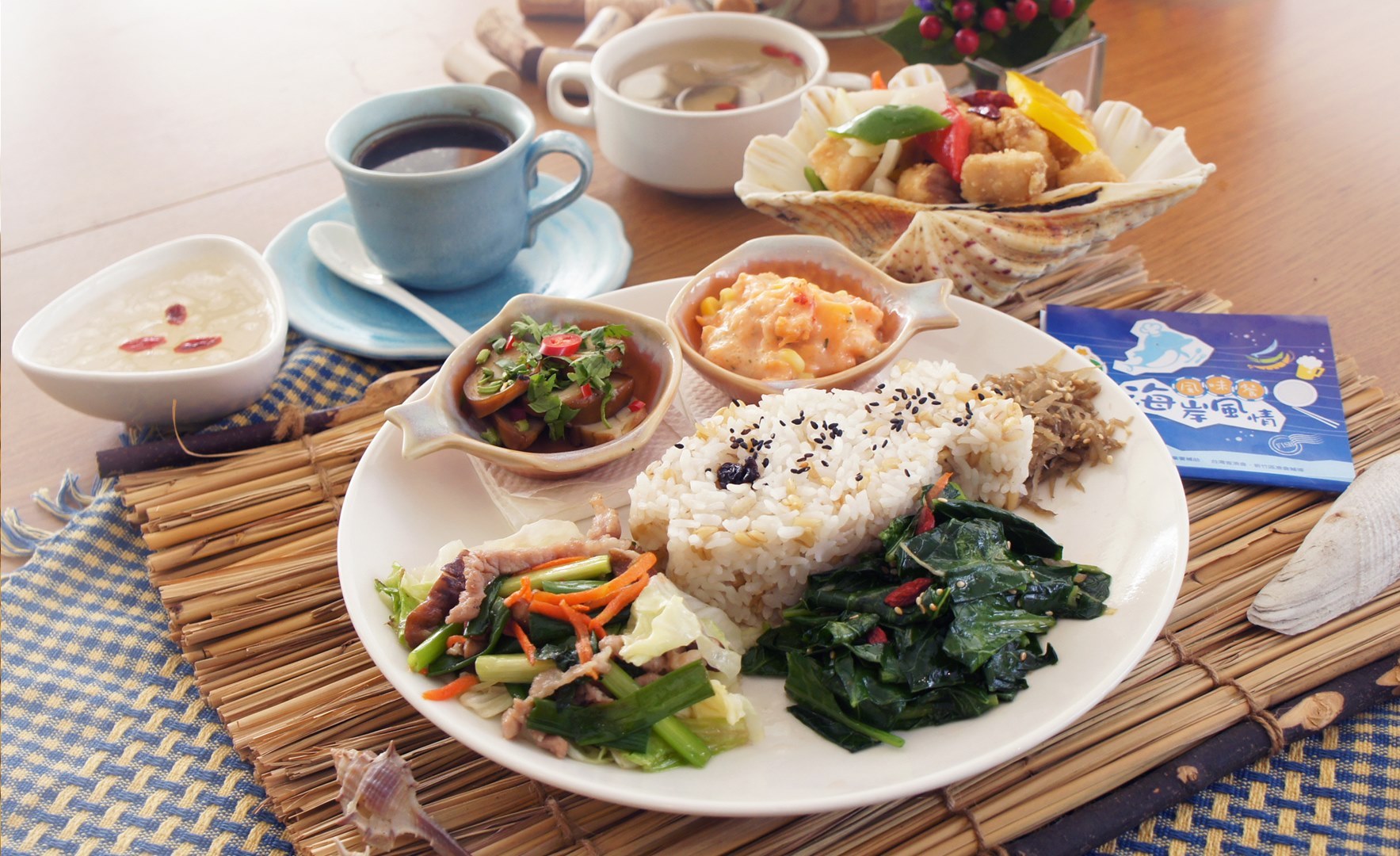 在南寮老街、漁港兜風一圈,我們來到漁港旁的海鮮餐廳,主廚已備好魚菜飯,準備用心款待。