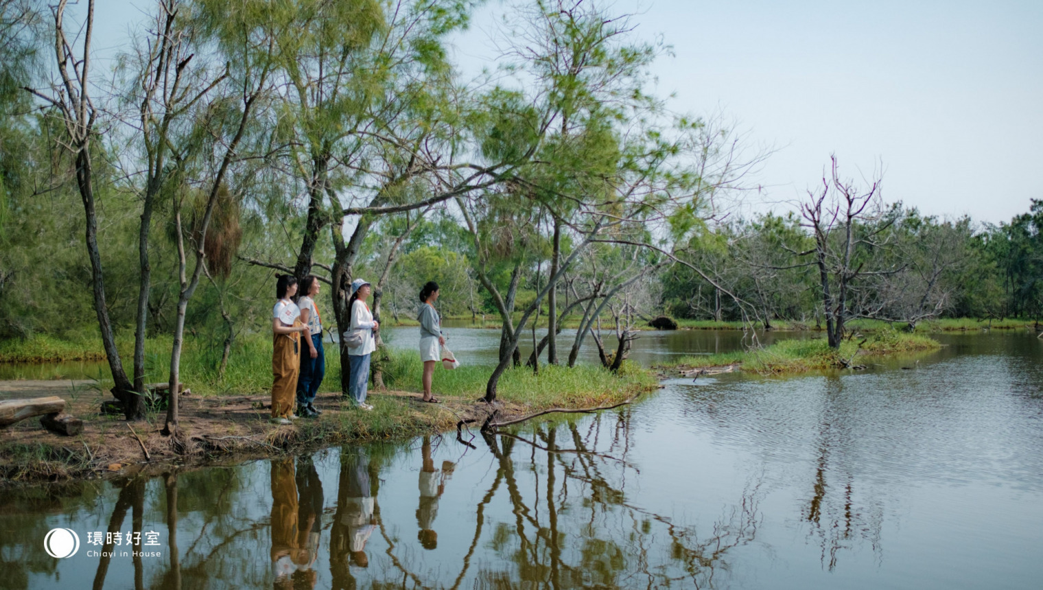 中午來到幽靜的保安林中,積水匯成了林間的渠,水面映著木麻黃堅韌的樹影,渠中的魚、林間的鳥都成了保安林的一分子,在林間歇息感受人與自然的動態平衡。接著回到室內品嘗匯集布袋在地食材、幾乎零碳足跡烹飪而成的料理,鮮蚵、蛤蜊、虱目魚、還有出乎想像清脆甘甜的苦瓜、菜脯,根據不同的季節將會嚐到不同的布袋好肥美料理!