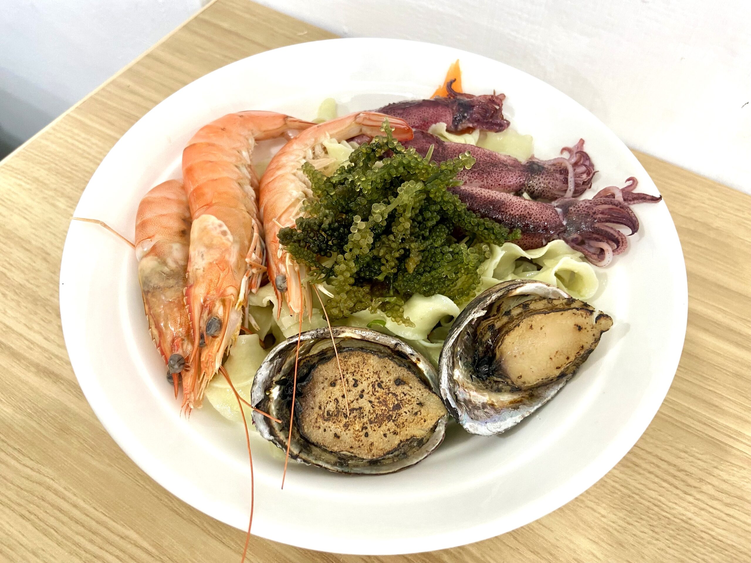 午餐將品嚐在地友善水產風味餐,包含貢寮才吃的到「海葡萄波波麵」,佐生態混養的海葡萄、白蝦、九孔,和東北角新鮮有名的小卷,都將在午餐上桌!炙燒、香煎、水煮樣樣來,親手體驗「0廚藝也能做的海鮮料理」,不用跑去沖繩,就能拼裝專屬台灣東北角在地物產的「海味大四喜」!