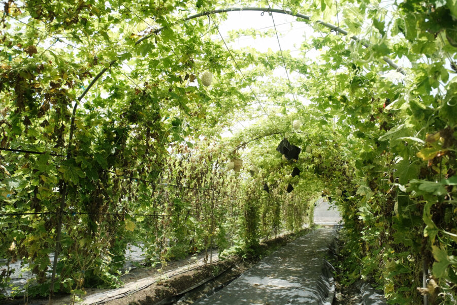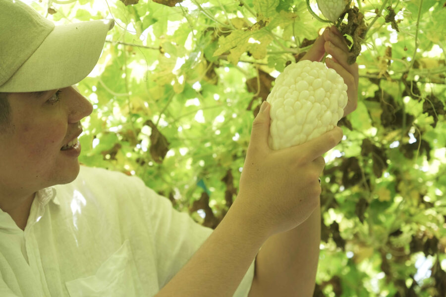 跟著農場主人到葡萄園般的苦瓜篷下採集苦瓜,了解布袋特殊的鹽土如何孕育出獨特的「蘋果苦瓜」。